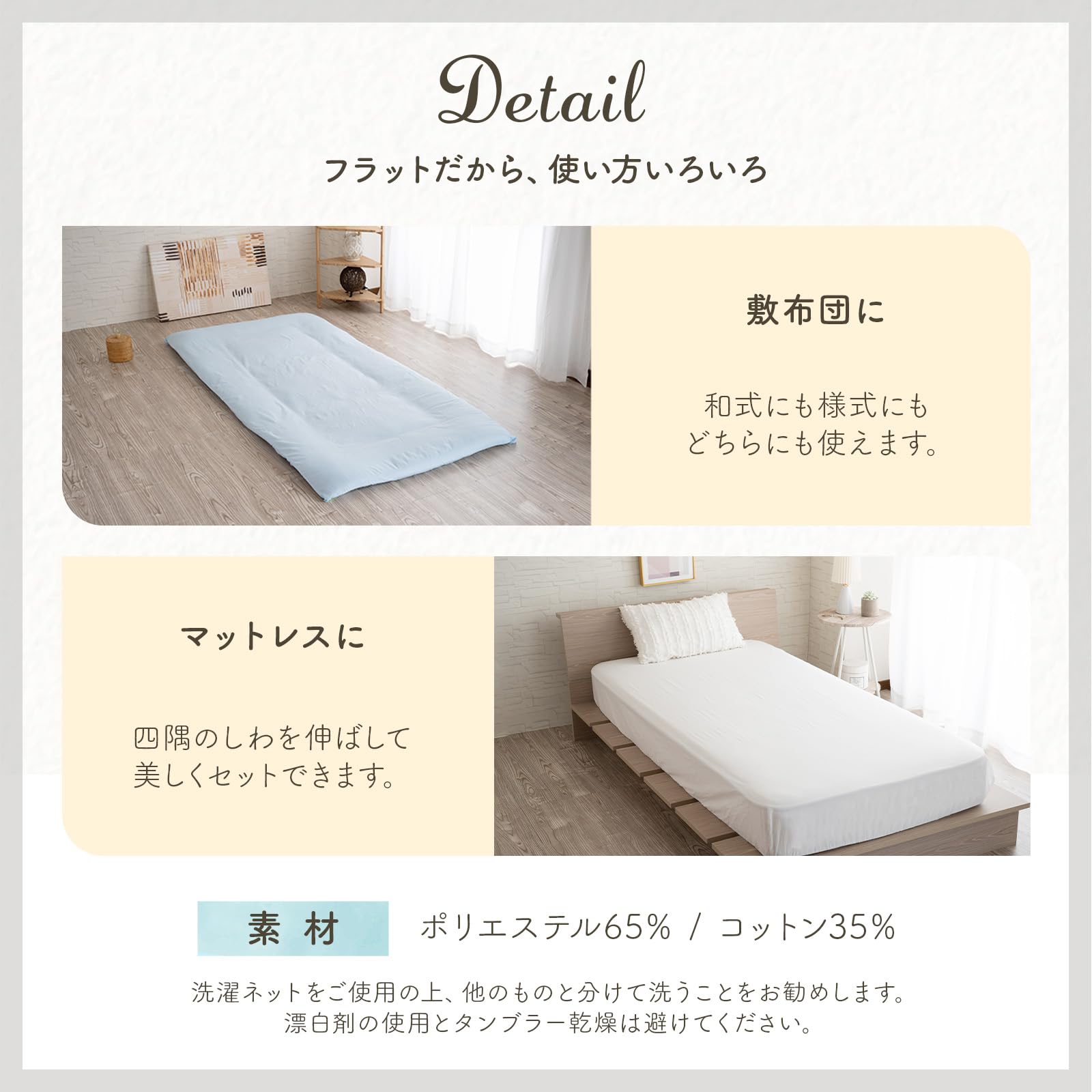 【急な来客に】来客用に重宝します:敷ふとん用シーツやベッドメイキング用シーツとして、幅広くお使い頂けます。急な来客にもすぐに対応でき、何枚持っていても大変重宝するシーツです。※フラットシーツは一枚布タイプのシーツです。ファスナー、ゴム等は付いておりません。