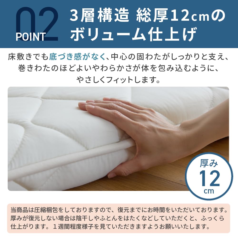 抗菌防臭・防ダニ機能付きで、ボリュームも12cmと床付き感がないしっかりした三層敷き布団になります。