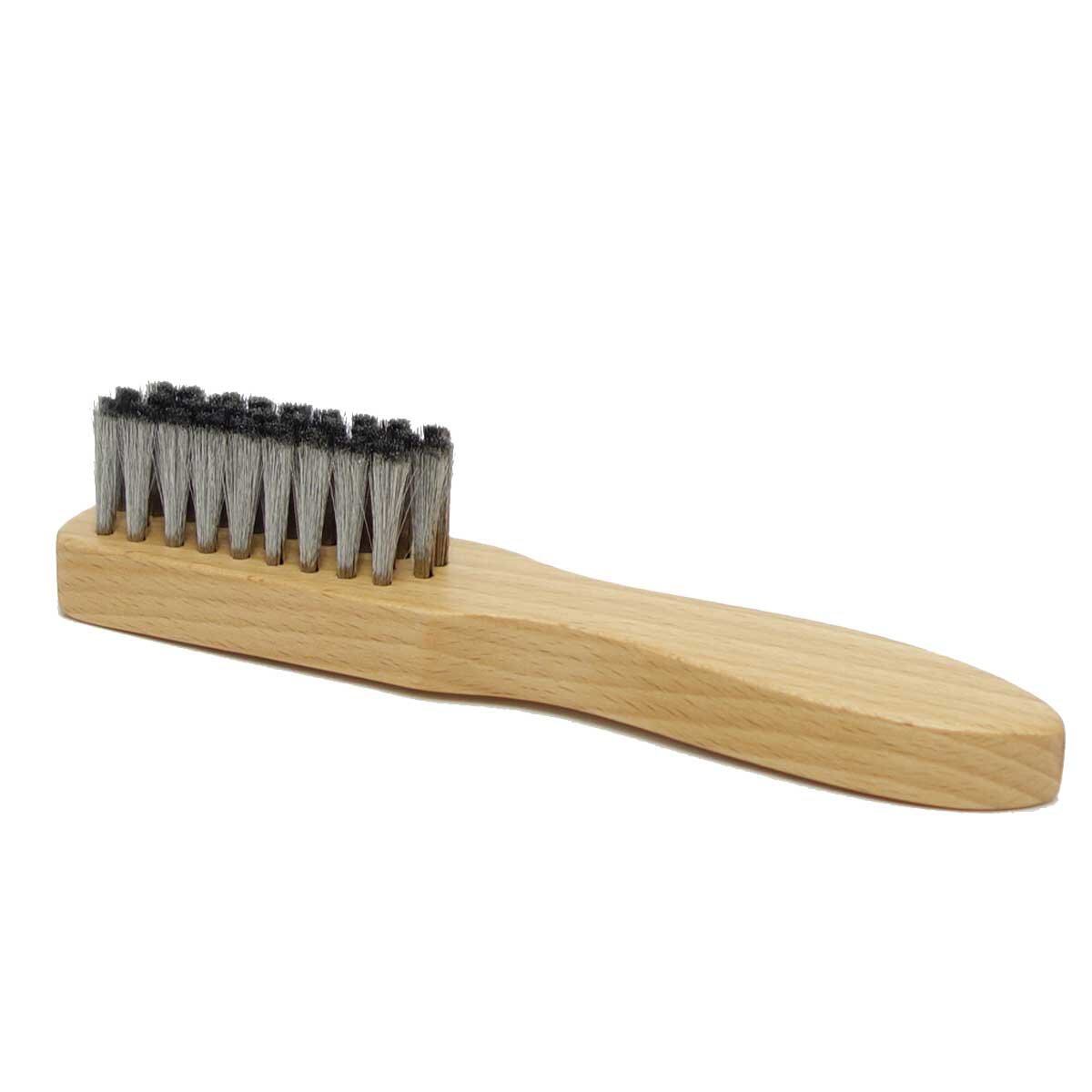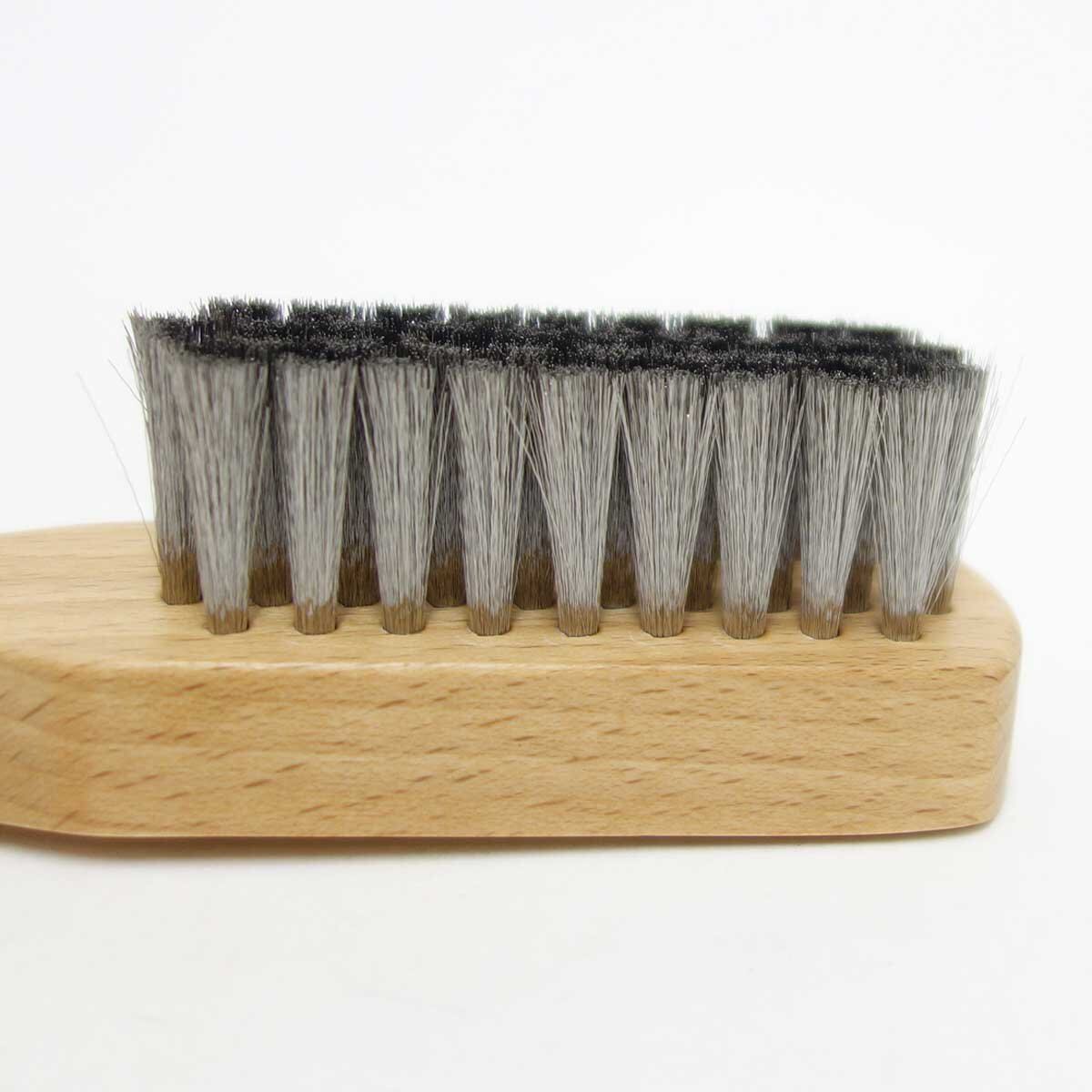スエードやヌバック、ムートンなどの起毛革用お手入れブラシです。水に強く、サビにくいステンレス毛を採用。0.08mmの極細ステンレス毛で、デリケートな起毛革の毛足を傷めることなくブラッシング可能です。適度なコシを持たせているので、寝てしまった毛を起こす際にも活躍します。