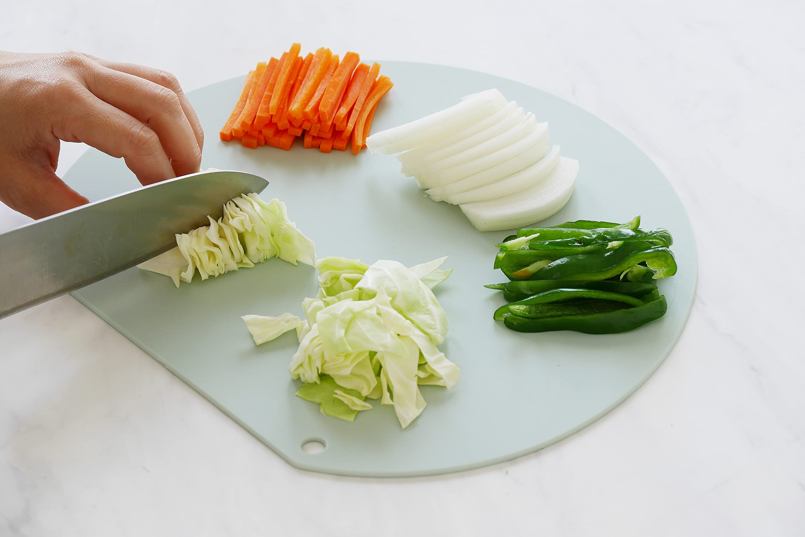 伊原企販 刃当たりなめらか抗菌まな板 スモーキーグリーン ワイド NC-SGL 抗菌(Ag+抗菌剤を練り込み)/ ワイド 切り分け上手で使いやすさを追求しました。 手前で切ったものを奥に並べていけるD型タイプのまな板です。 抜群になめらかな切り心地です。また、抗菌剤は直接樹脂に練り込んでいるためキズがついても抗菌効果は落ちません。