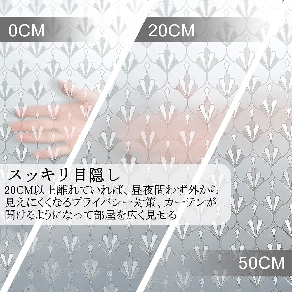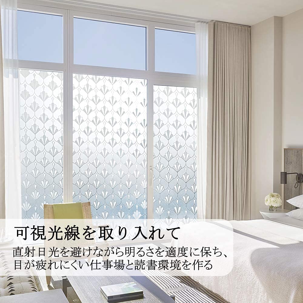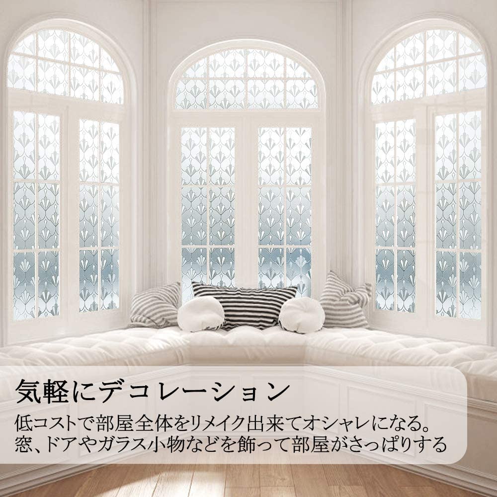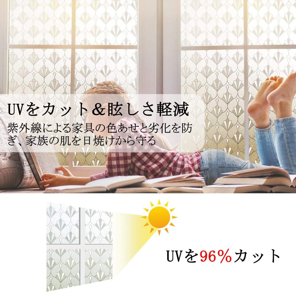 プライバシー保護:可愛い花柄デザインのすりガラス調窓ガラスフィルム。光加減で見た目は上品で綺麗です。貼れば外からも室内からも見えにくいです。光をちゃんと取り込めるので、明るいまま、目隠しになります。仕事や遊びが安心できます。ブラブラするカーテンと違って、部屋がすっきりして明るく綺麗になります。紫外線を遮断して眩しさやわらげ、エアコンの効きが良くなります。