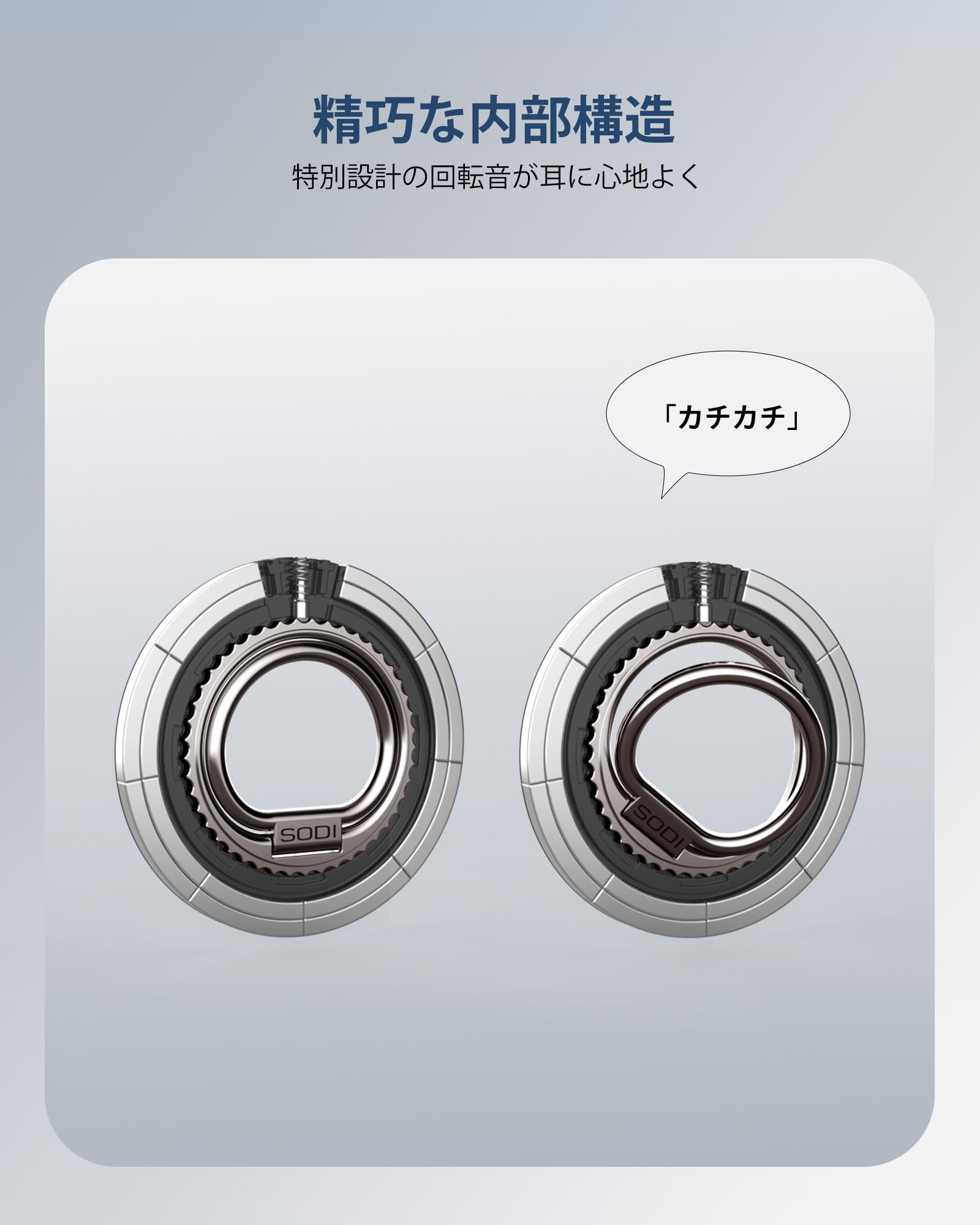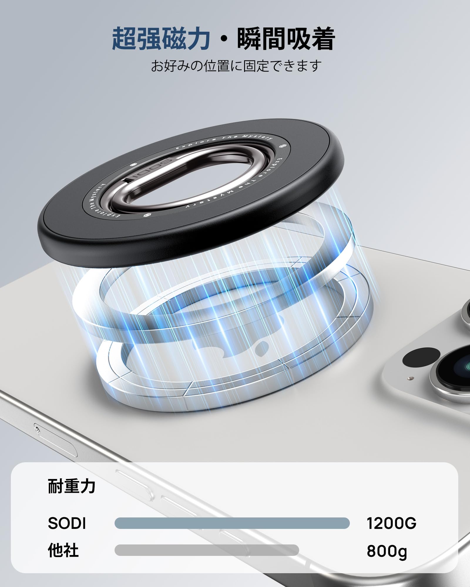 ??【超強力な磁力】SODI MagSafe対応スマホリングは超磁力磁石*16を採用しており、iPhone 17 Pro*8台までの荷重に耐えます。強力マグネットでiPhoneをしっかり吸着でき、ずれ落ちる心配なく快適です。また、跡を残さず取り外し可能で、スマホをきれいな状態でご利用いただけます。マグセーフ対応のワイヤレス充電器やスマホアクセサリーに簡単に交換できます。