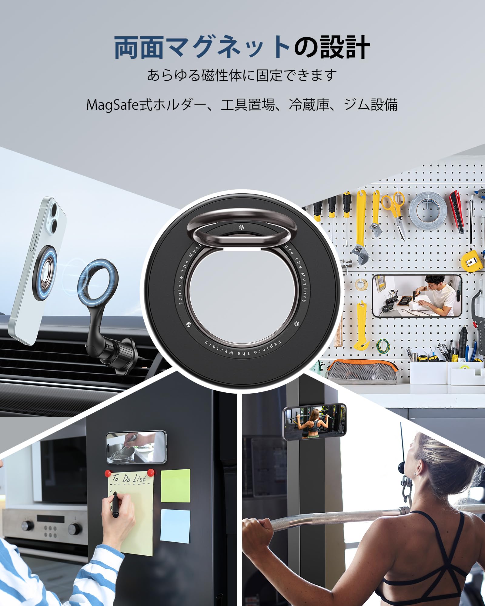 ?【両面マグネット式】従来の片面磁石と比べて、両面磁力なので、スマホをMagSafe式車載ホルダー、冷蔵庫、テーブル、洗濯機、ジム設備、更に車体などあらゆる磁性物に取り付けます。(??ご注意:ホルダー側の磁力がiPhoneの磁力よりも強いため、リングがホルダー側にに残る可能性があります。)非磁性物には付属のメタルリングが貼り付けられましたら、磁力化にすることが可能です。この両面マグネットリングを使て、両手が解放して、いつでも自由自在に携帯電話でTiktok、Twitch、Facebookなど楽しめます。