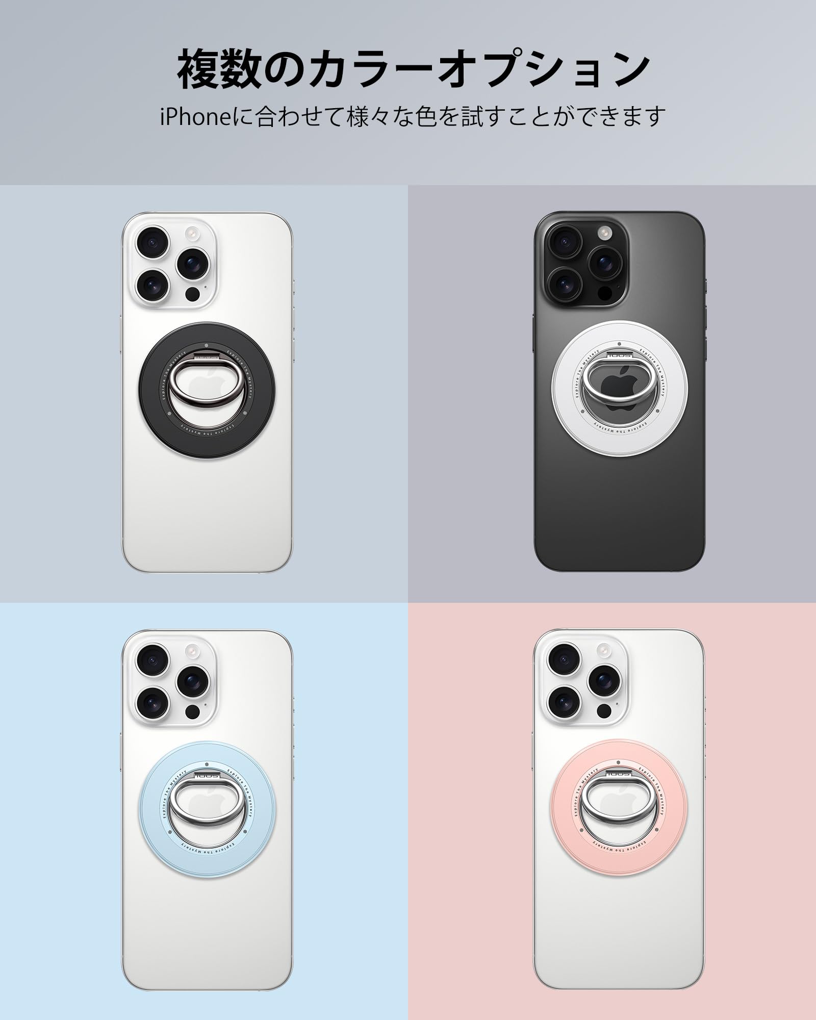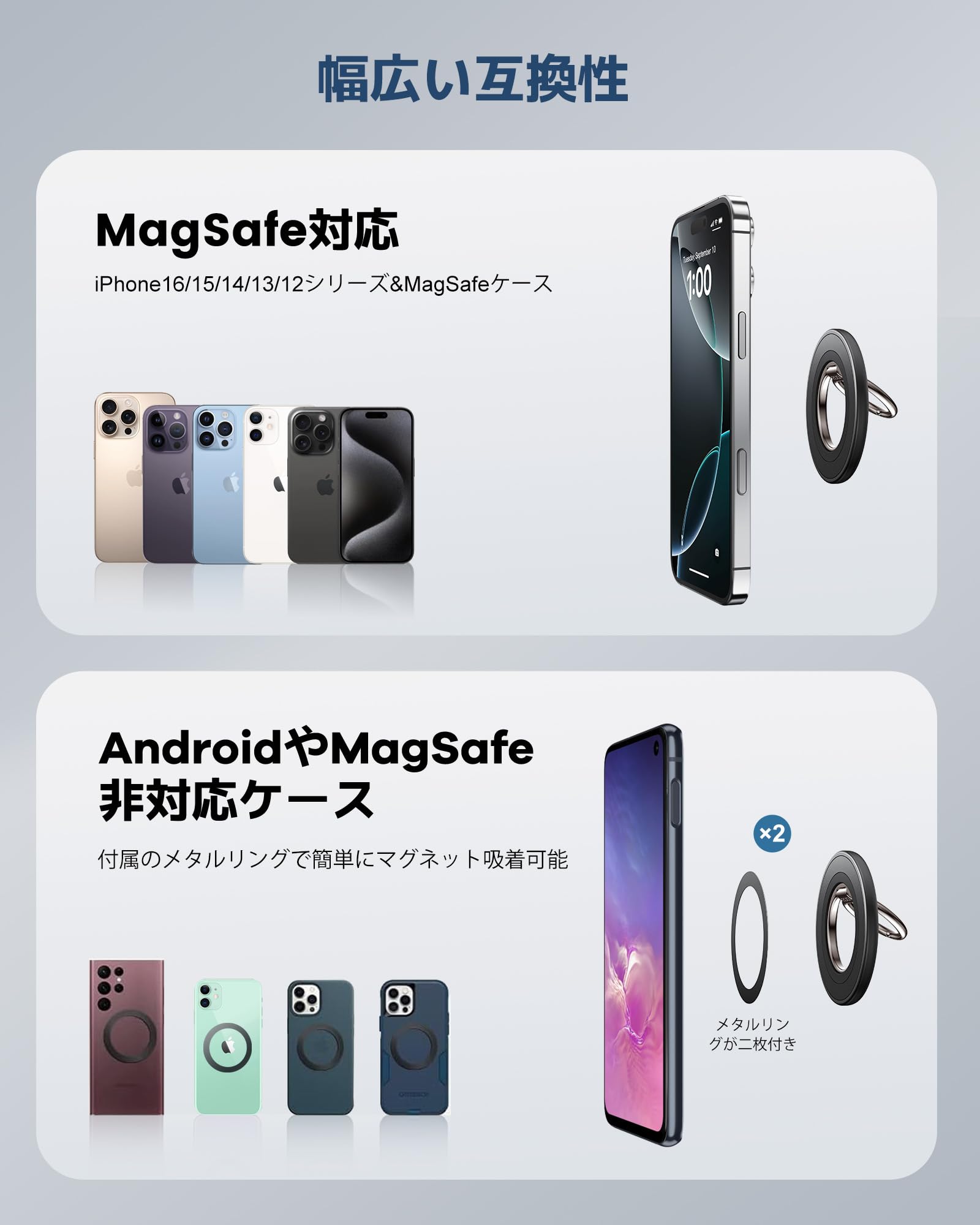 ?【対応機種】iPhone Air,iPhone17、17Pro、17Pro Max,iPhone 16、16Plus、16Pro、16Pro Max, iPhone 15、15Plus、15Pro、15Pro Max, iPhone 14、 14pro、 14pro max、14Plus, iPhone 13、13 Pro、 13 Pro Max、13 mini, iphone 12、 12 Pro、12 Pro Max、12 miniやMagSafe搭載ケースに直接装着可能です。付属されたメタルリングを利用すると、磁力がもっと強くなります。iPhone 11/iPhone X /iPhone 8/ SEまたはSony Xperia、SHARP AQUOS、Samsung GalaxyなどMagSafe機能帯びないスマホとケースは付属のメタルリングを貼れば簡単に使用することもできます。