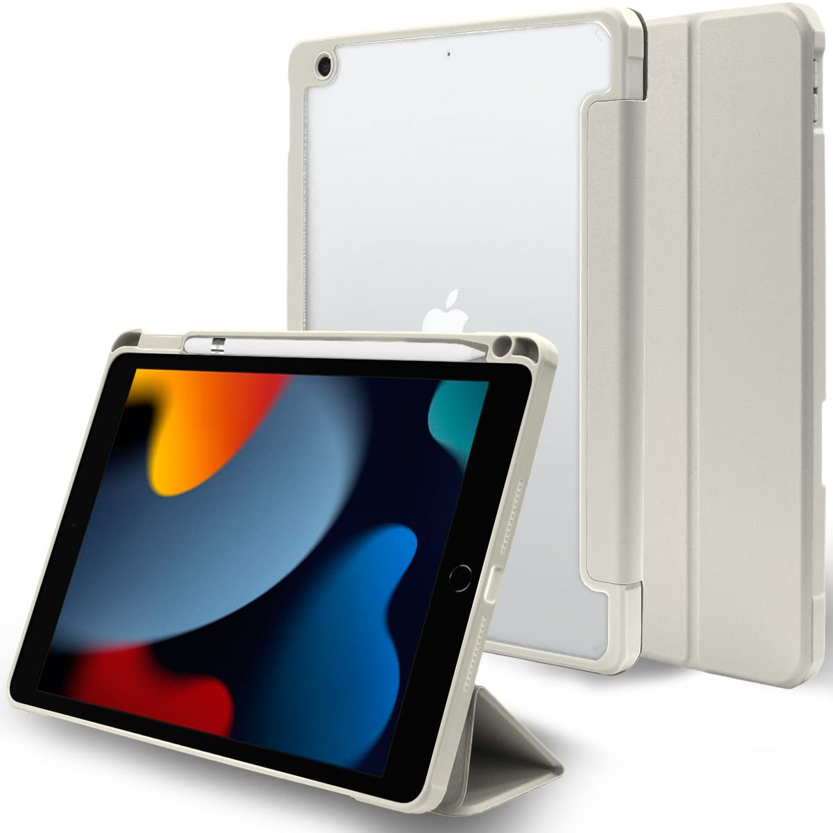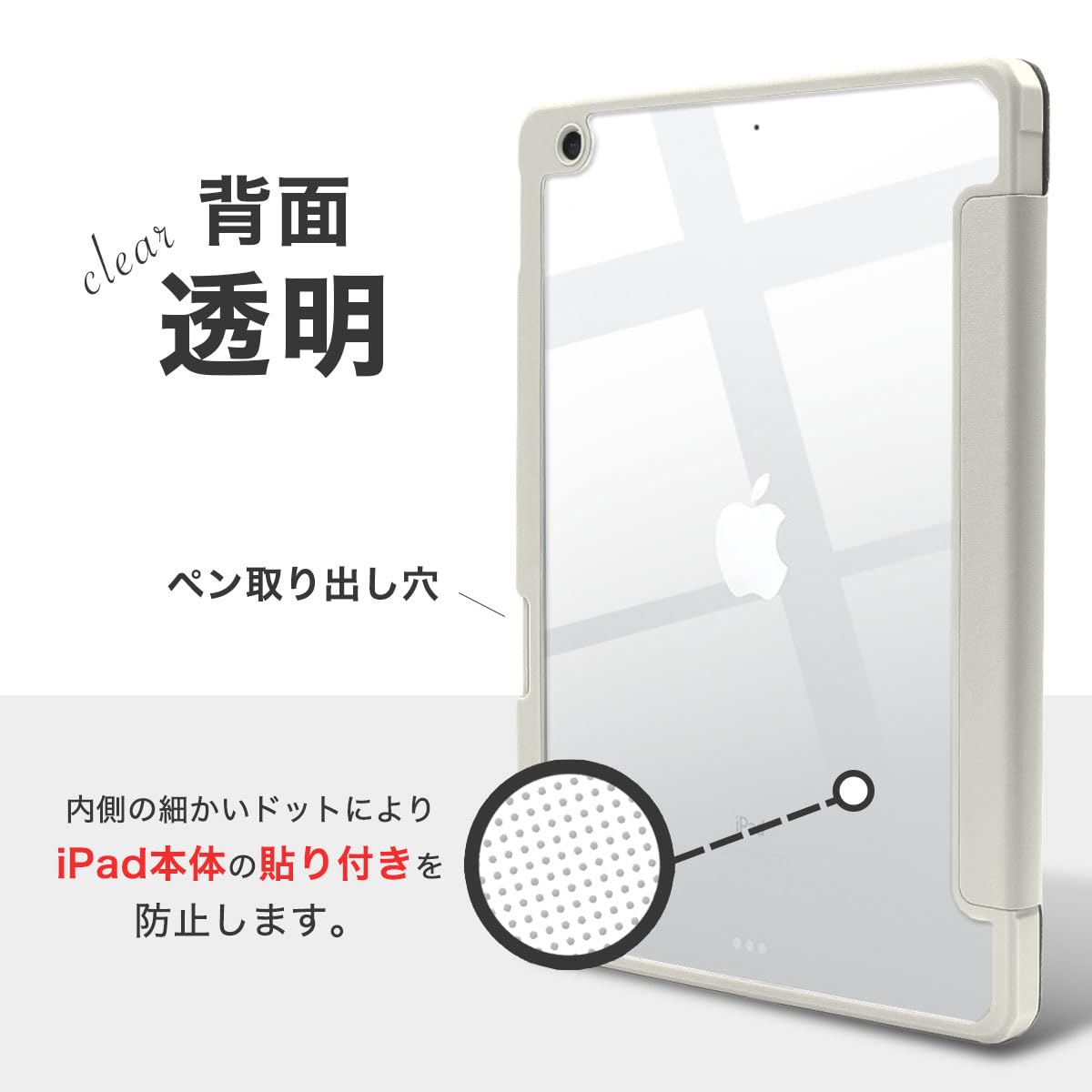 ★【 Appleロゴが見える背面ケース 】 Appleロゴが透けて見える背面ケースは透明なので、デザインを損ねることなく保護できるケースです。また、iPad本体にケースが貼り付くのを防ぐために背面ケース内側には細かいドット加工を施しています。 ★【 オートスリープ対応 】 カバーの開け閉めで スリープ解除 / スリープ に対応します。 ★【 スタンドケース 】 動画鑑賞や文字入力などに最適な2wayスタンドになります。 ★【 マグネット開閉式 】 マグネットで液晶カバーを開閉できます(磁気干渉防止のためにマグネットの磁気は弱めになっています) ★【 Apple Pencil 充電可能 】 ケースを装着したままでもApple Pencil 第1世代を充電コネクタに挿して充電可能です。