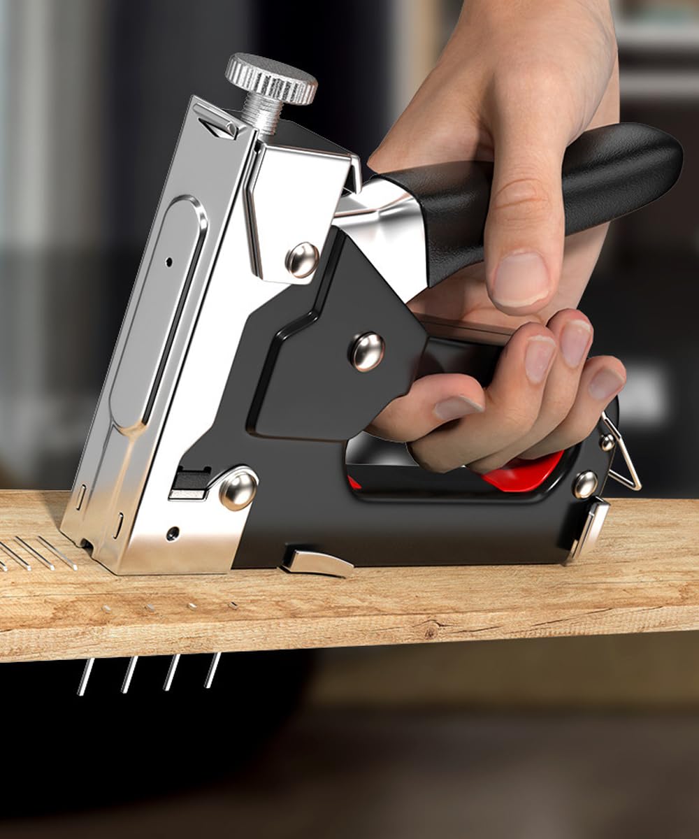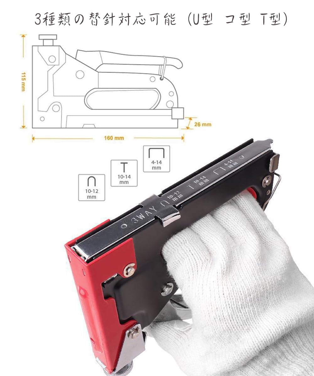 「高品質」ステンレス製、トップスプリング構成、しっかりとした耐久性、迅速かつ高強度で釘付け。本体上部のツマミで針の打込み強さを調節可能、女性でも使えるように簡単操作。