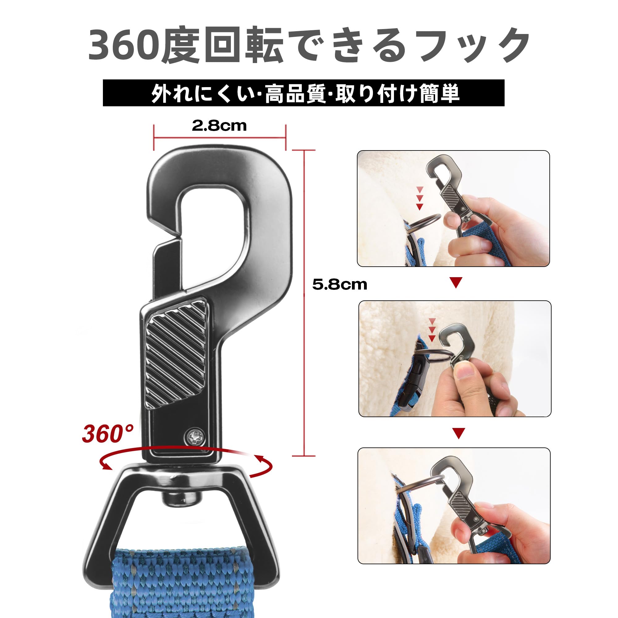 【強化高品質フック】犬リード頑丈のフックは当社が専用設計したもので、その特徴は軽く押すだけで首輪に固定できる点です。さらに、リード犬丈夫のフックは頑丈な金属素材で製造されており、犬りーど中型犬リードフック耐荷重は最大220キログラムで、引っ張る習慣のある犬に最適です。