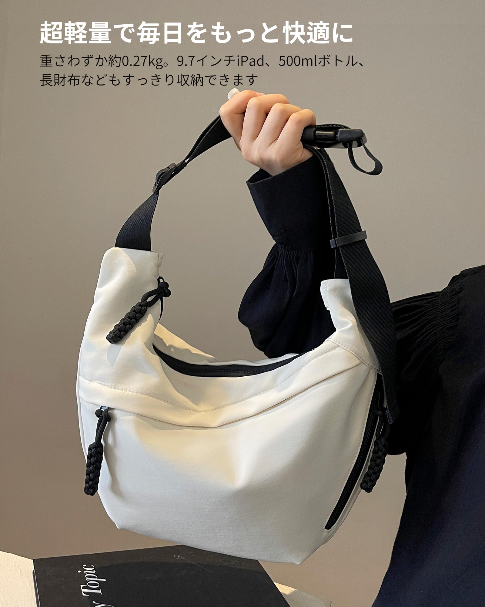 【超軽量&コンパクト設計】わずか約0.27kg、サイズは36×24×8cm。ペットボトル、タブレット、財布、折りたたみ傘など、必要な物をしっかり収納しながらも軽快に持ち運べます。