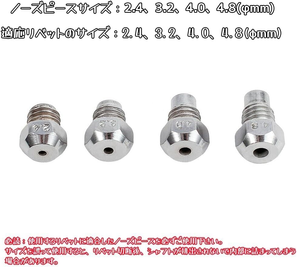 【サイズ】ノーピースサイズ:2.4-3.2-4.0-4.8(φmm) 適応リベットのサイズ:2.4、3.2、4.0、4.8(φmm) 必読:使用するリベットに適合したノーズピースを必ずご使用下さい。サイズを誤って使用すると、リベット切断後、シャフトが排出されないで内部に詰まってしまう場合があります。