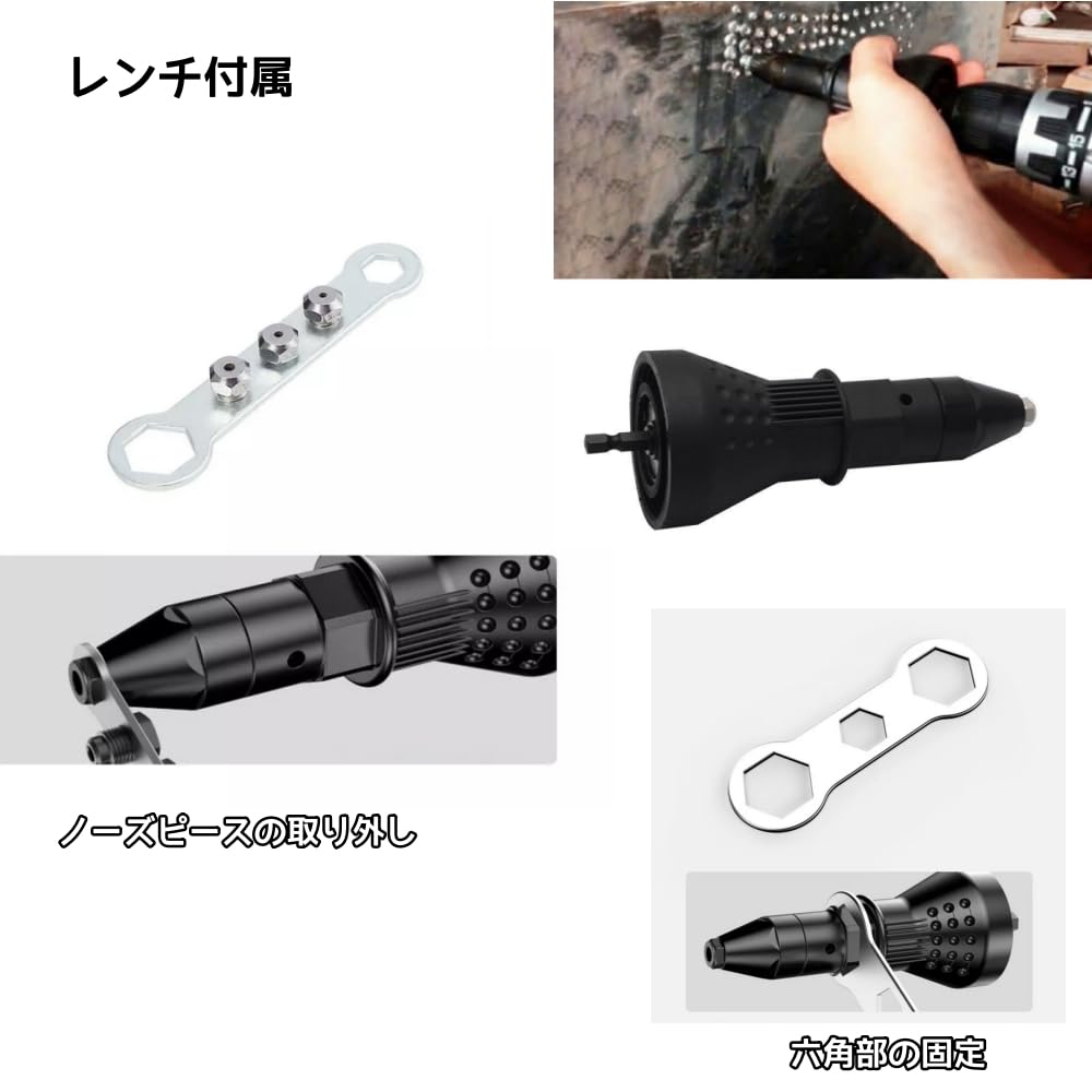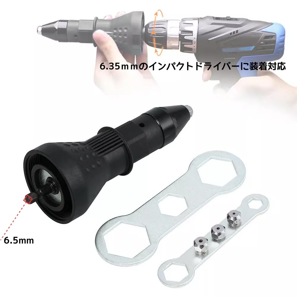 【使用方法】1.使用するリベットのサイズに合わせてノーズピースを選び本体先端に取り付けます。2.電動ドライバーのチャックに本体を取り付けます。3.電動ドライバーを逆転させて本体内部のジョーをノーズピースに当たるまで進めます。ノーズピースに当たるとジョーが開きリベットをセットできます。4.本体のグリップを握って電動ドライバーを正転でリベッティング。