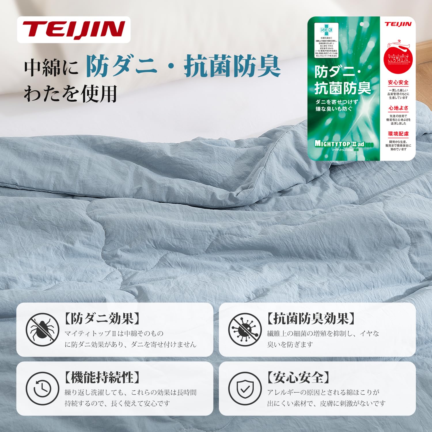 ? 中綿に防ダニ・防菌防臭のTEIJIN綿を使用しているので、細菌の増殖を抑制し、イヤな臭いを防いで、アレルギーの体質の方にも適しています。