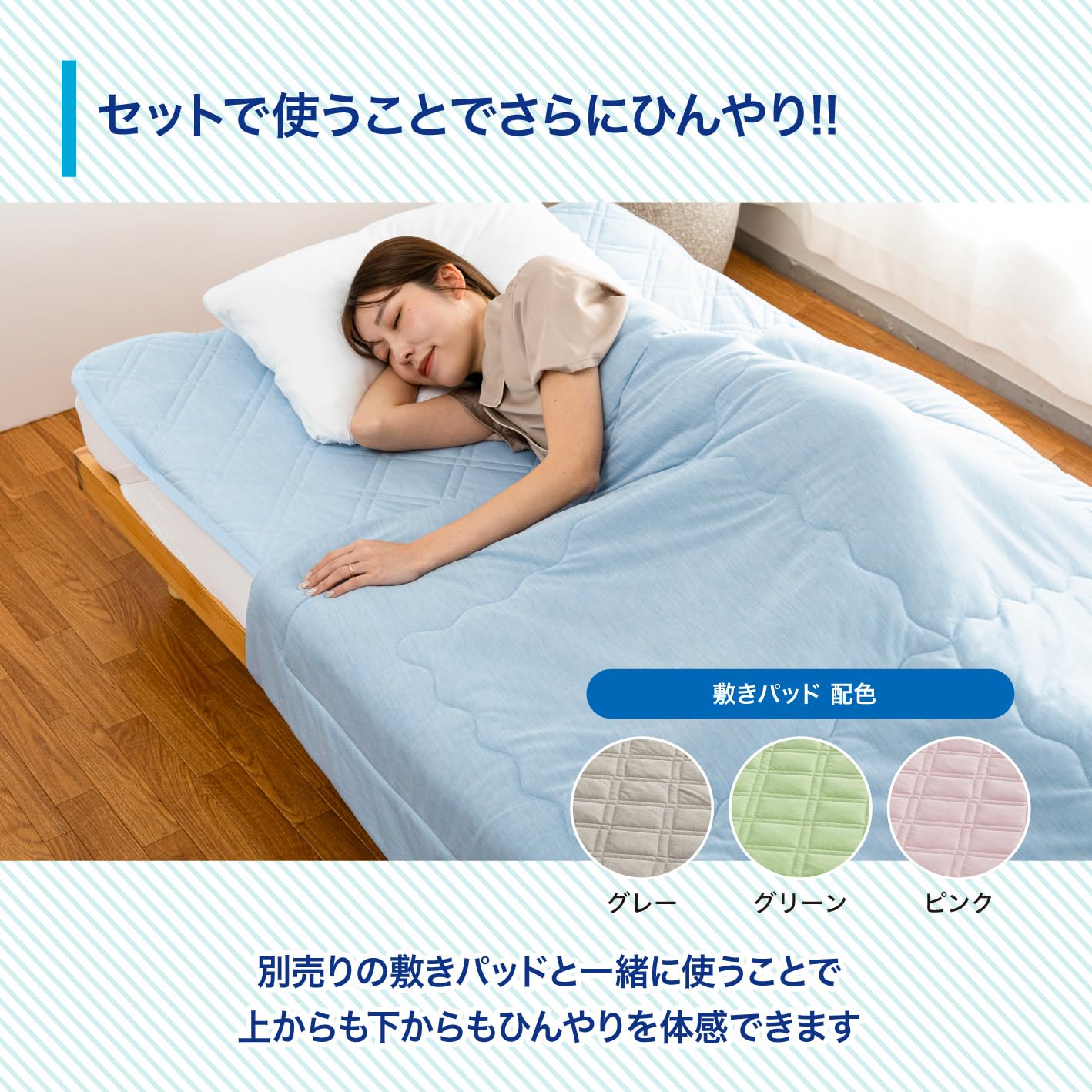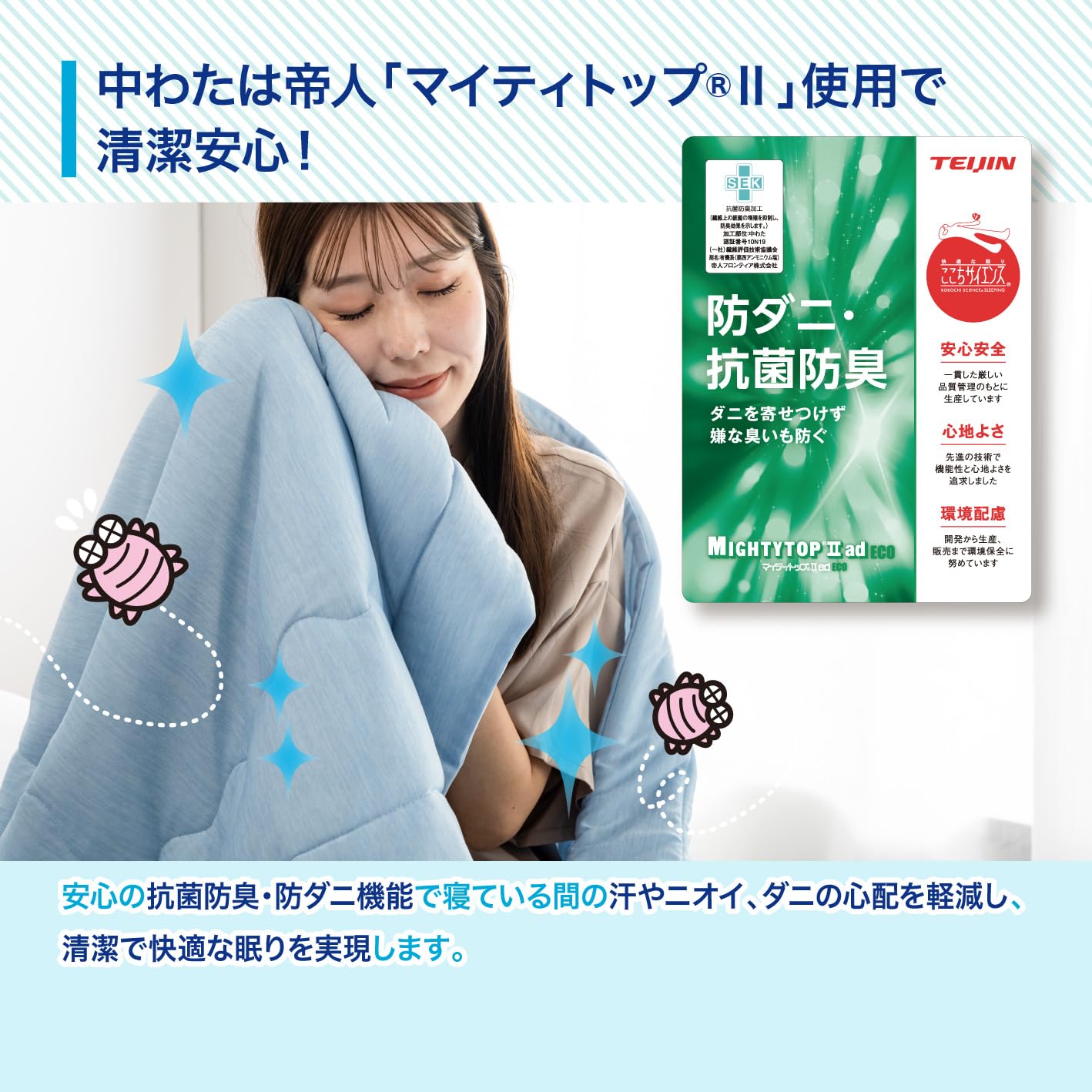 ?【雑菌抑制&防臭で清潔な眠り】中わたには帝人の高機能素材「マイティトップⅡ」を採用。雑菌抑制・防臭・防ダニ性能を備えた夏におすすめの掛け布団として、家族の健康を気遣う方も心配なく使っていただけます。冷感ブランケットにプラスした衛生機能で、汗や湿気が気になる季節も快適。冷感素材のケット(タオルケット)に、清潔さという価値をプラスした寝具です。