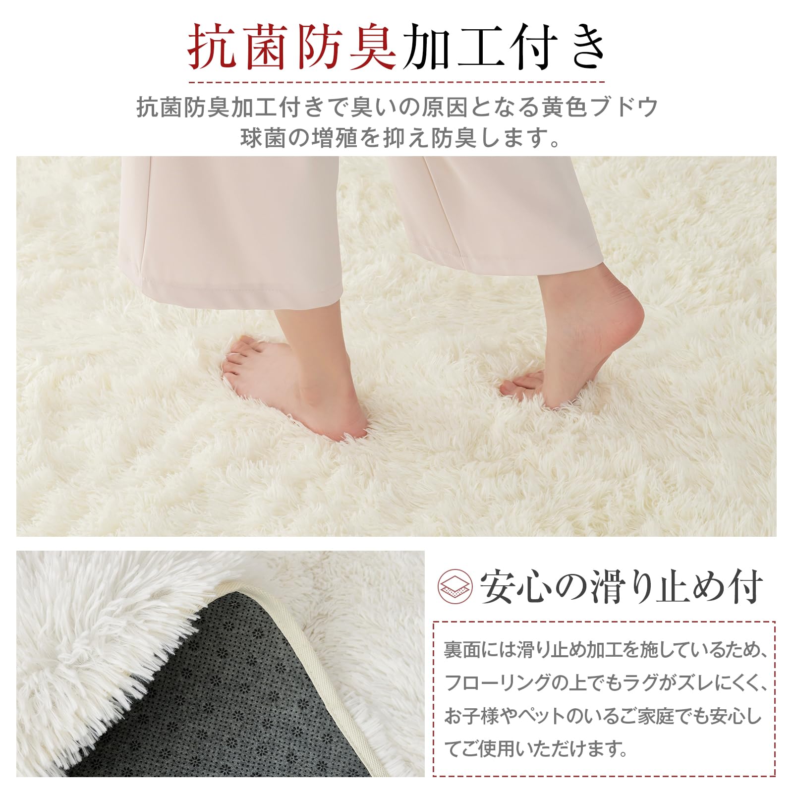 【抗菌防臭・滑り止めラグ】絨毯は抗菌防臭加工を施して、安全な品質で直接肌に触るのも大丈夫です。 ラグマットの裏面は滑り止め付き、ズレにくい、掃除機をかける時も滑らない。お子様のいるご家庭でも安心してお使いいただけます。