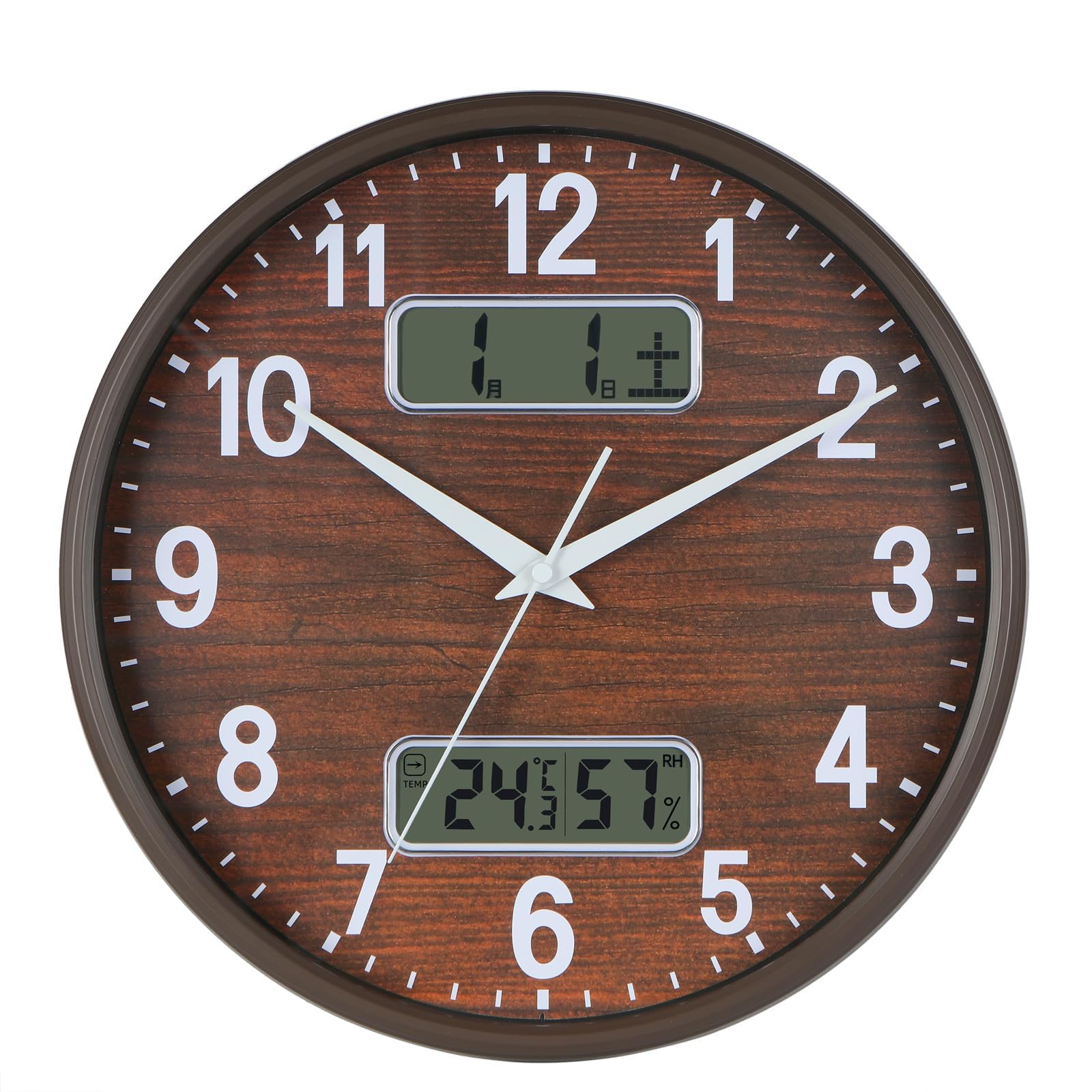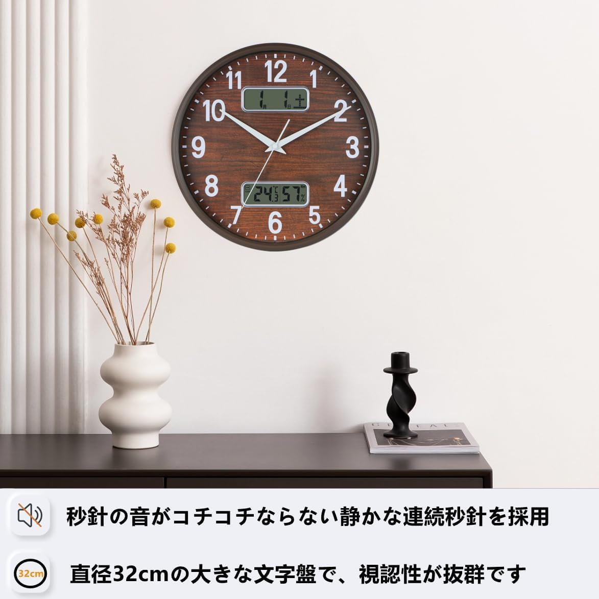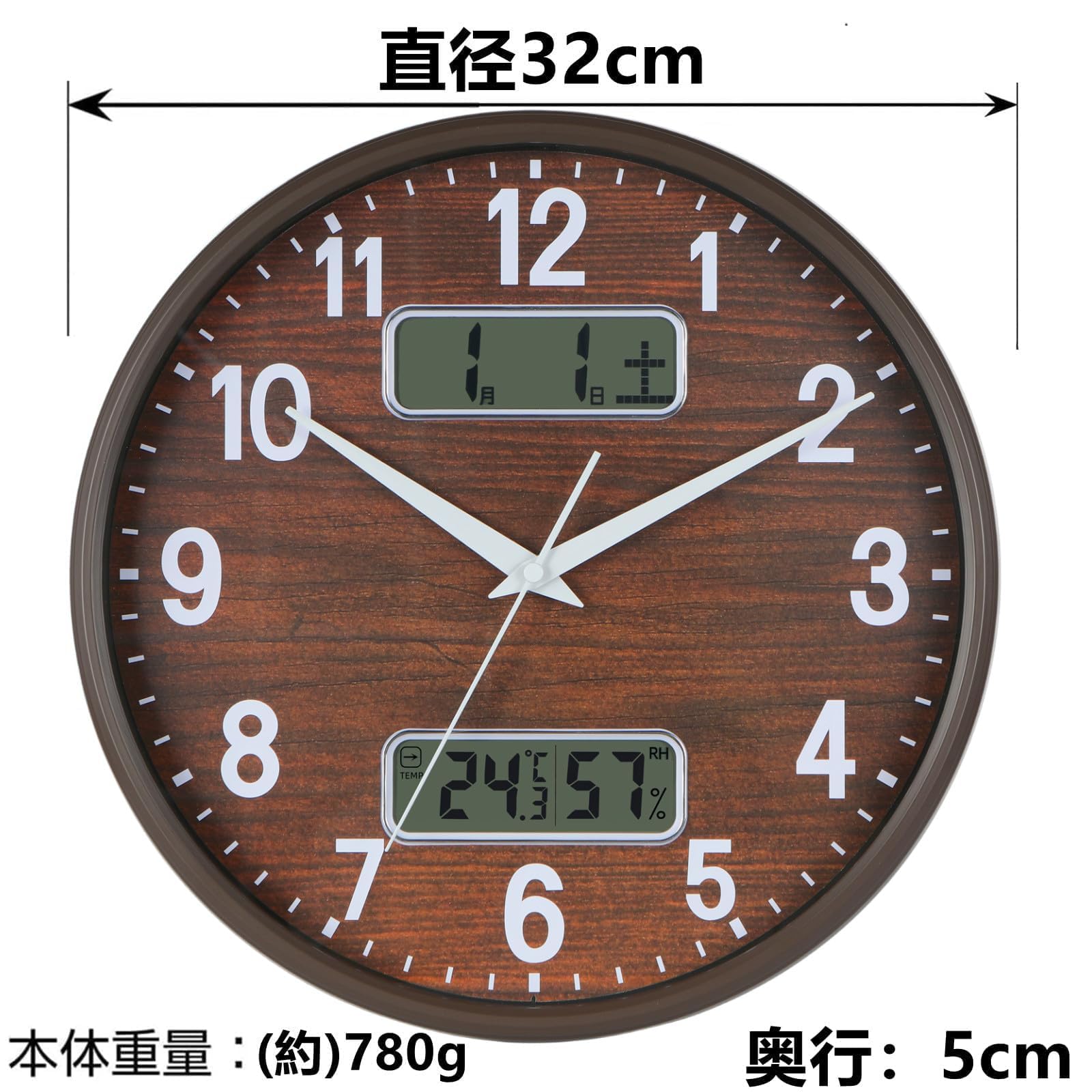 掛け時計 静音 連続秒針 アナログ カレンダー 温度 湿度 表示 直径32cm CSY-9997 コーヒー色