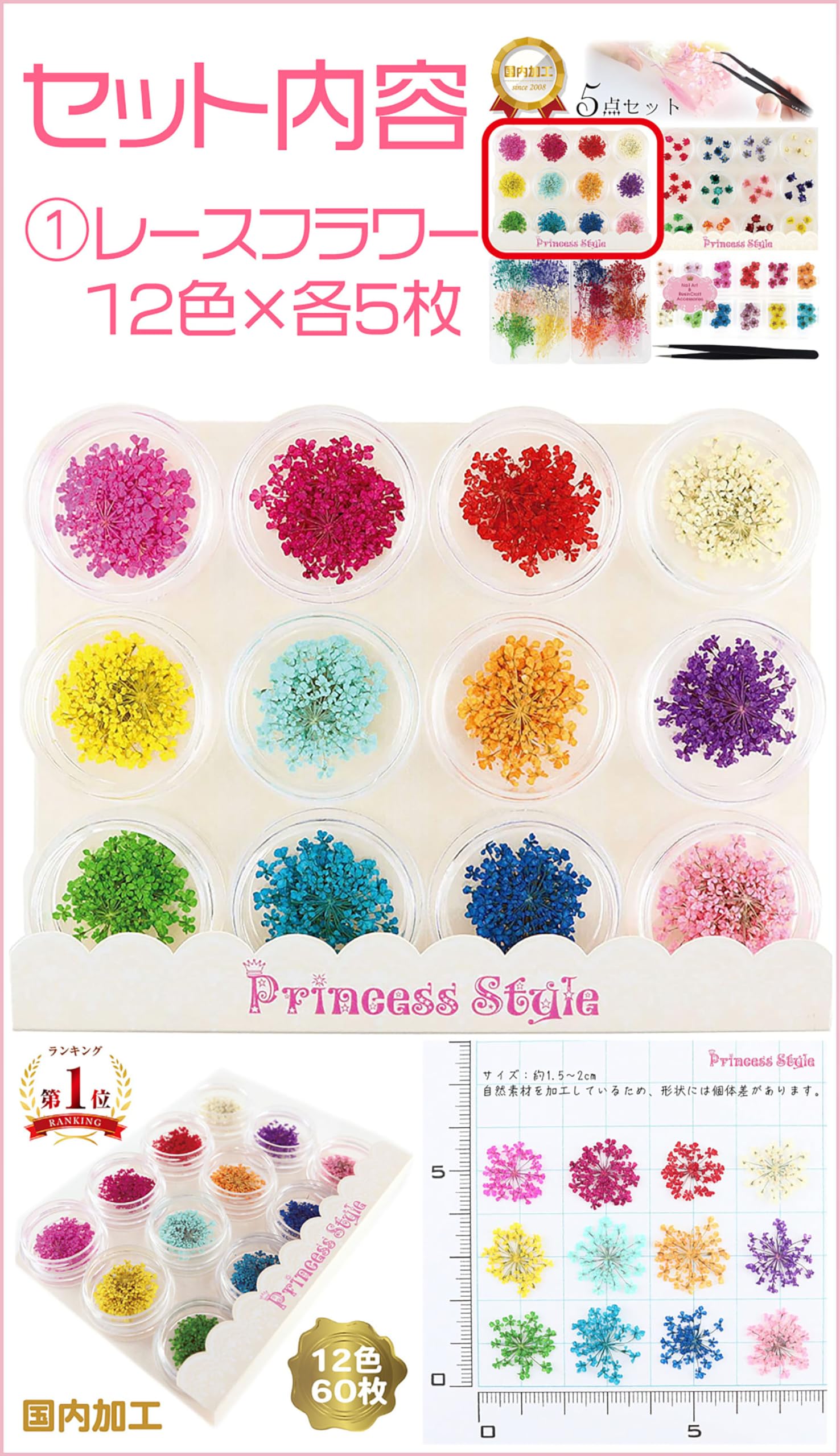 ・ドライフラワー 押し花 レースフラワー 12色 60枚 セット