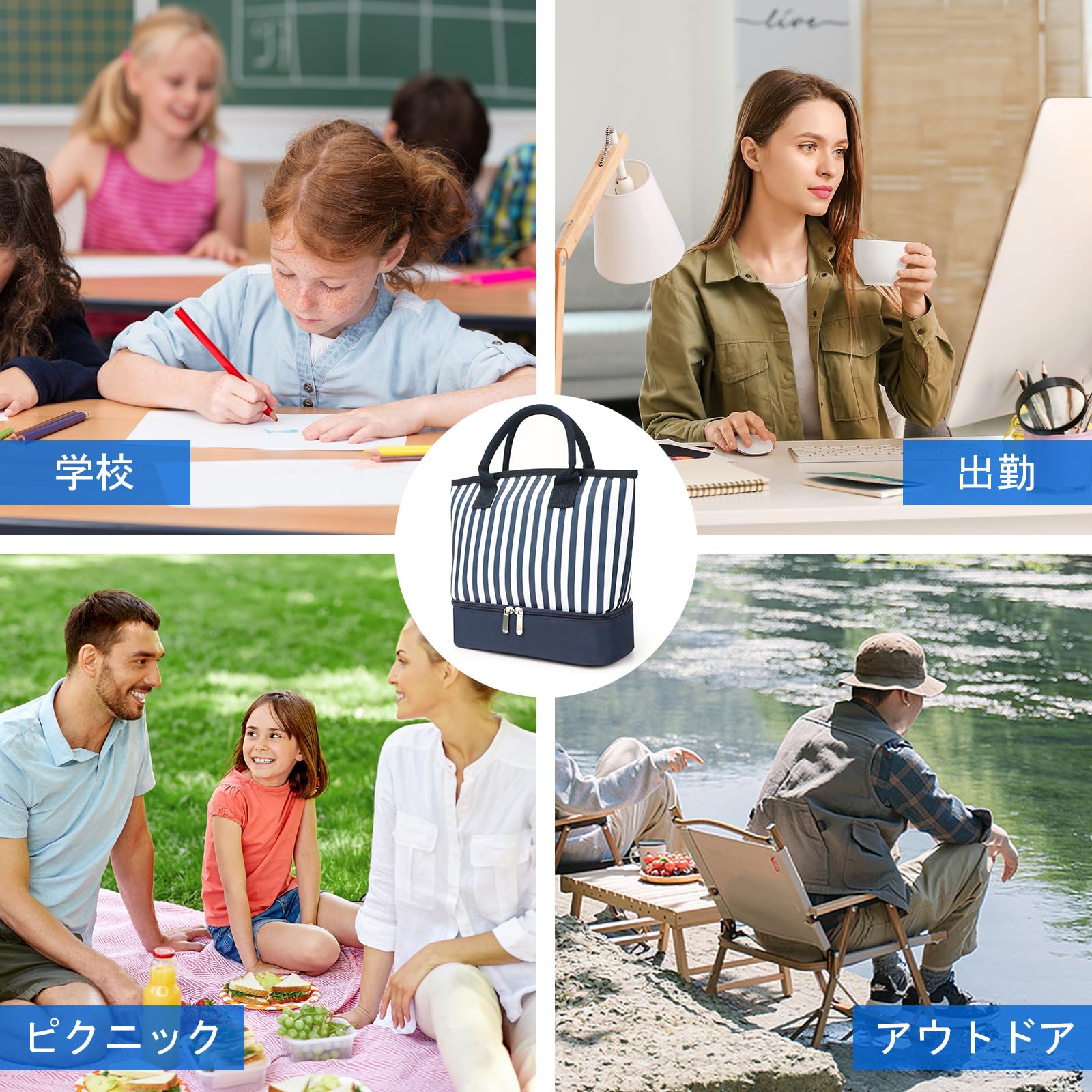 クラシックなブルーとホワイトのネイビーのストライプが特徴のスタイリッシュなデザインで、お弁当を持ち歩くときにファッショナブルで洗練された印象になります。このランチバッグの構造には耐久性のある素材が使用されており、日常の摩耗や損傷に耐えることができるため、毎日の使用に信頼できる選択肢になります。