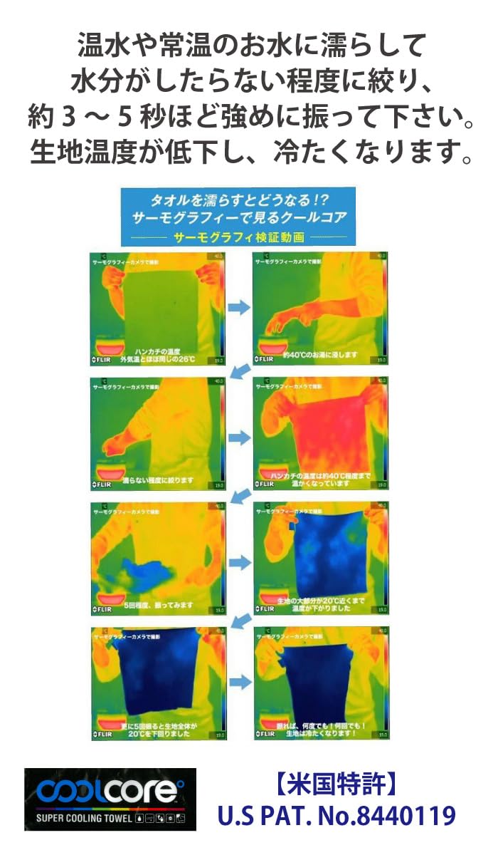 ??驚きのひんやり感!! 米国特許取得の冷感機能素材を使用した 『 POWERED BY COOL CORE 』クールコアタオル 独自開発の繊維により気化熱を効率的に発生させ、 即効性のある冷感を楽しんでいただけます。