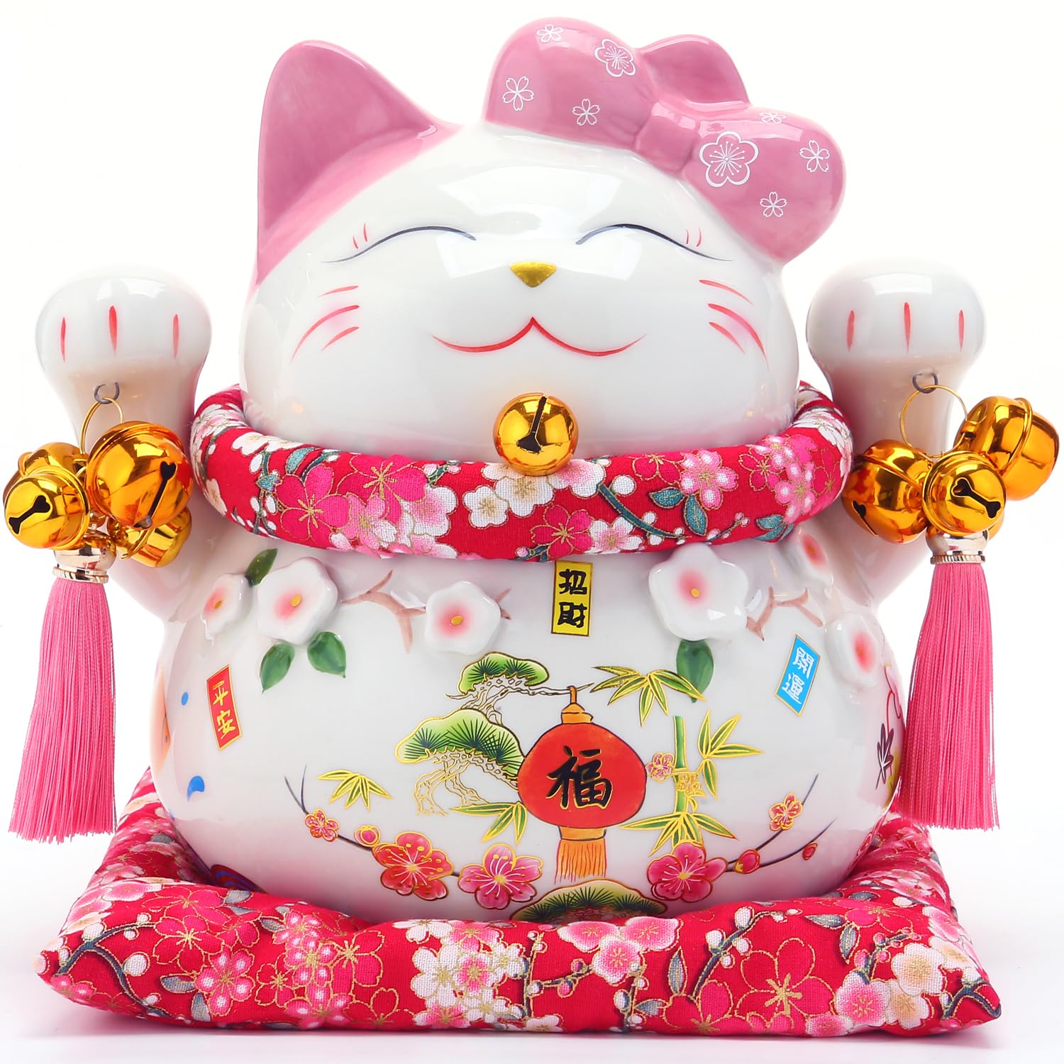 ピンクを基調とした華やかな装飾が施され、梅の花、松、竹が描かれた「松竹梅」のおめでたいデザインで、両手には福を招く鈴をぶら下げております。見ているだけでも華やかでほっこり楽しくなる招き猫となっております。