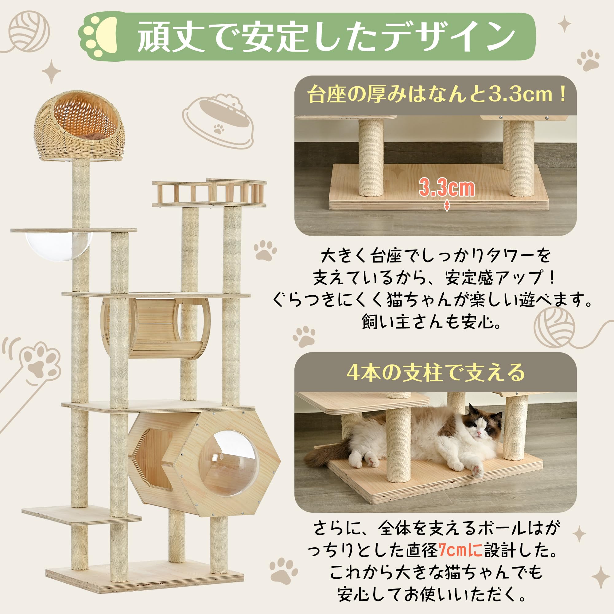 猫の寝顔を見える六角形デザインハウス、おしゃれな展望台、藤編みハウス 、トンネル、宇宙船など猫ちゃんが喜ぶ機能いっぱいなキャットタワーです。 子猫やジャンプ力の弱い子にも簡単に登られ、運動不足やストレス解散に大変お役に立ちます。