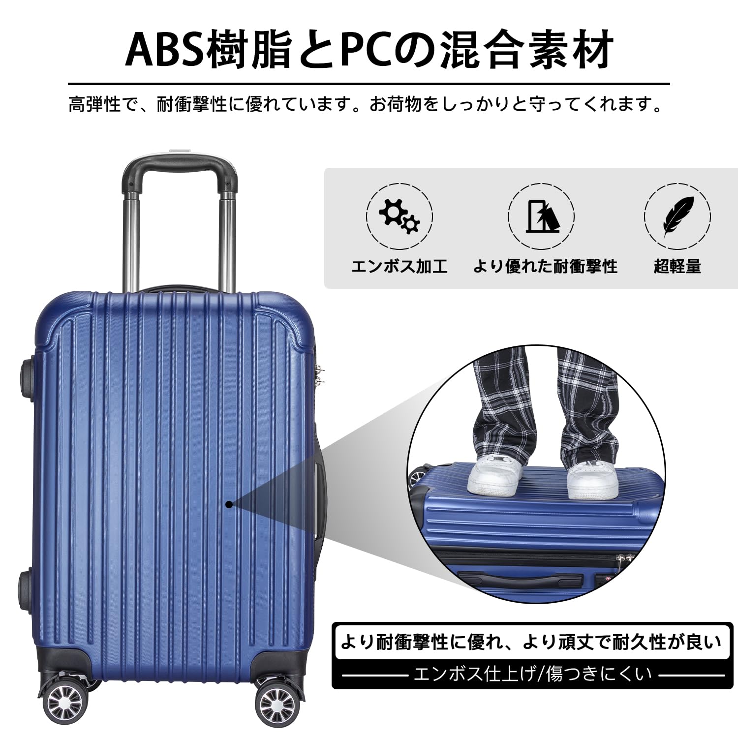【材質&TSAダイヤル式ロック】スーツケースはABS樹脂とPCでの混合素材で作られ、耐衝撃性に優れた上、高弾性で、変形しにくい。エンボス加工、傷つきにくい。アルミフレームスーツケースより軽量で持ち歩きやすい。TSAダイヤル式ロックが搭載されて、外出がより安全。また、鍵穴は航空会社検査専用の物です。本製品に鍵は付属しておりません。