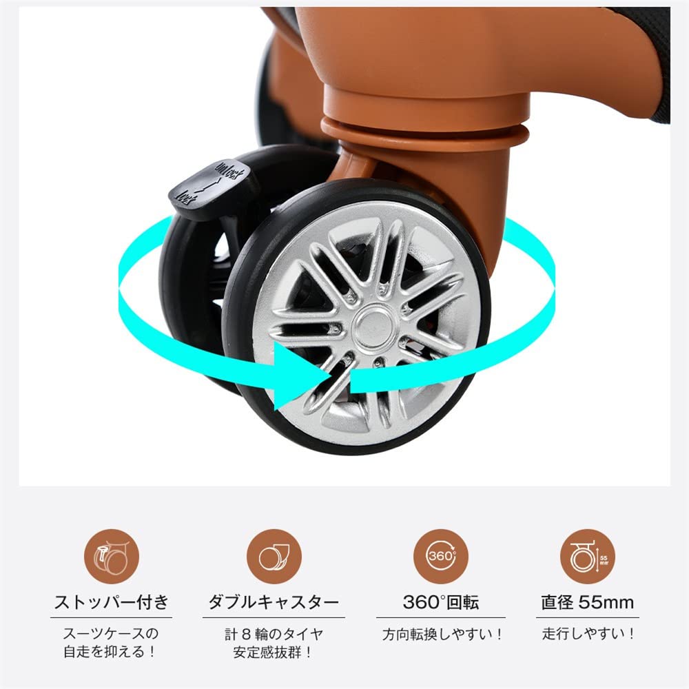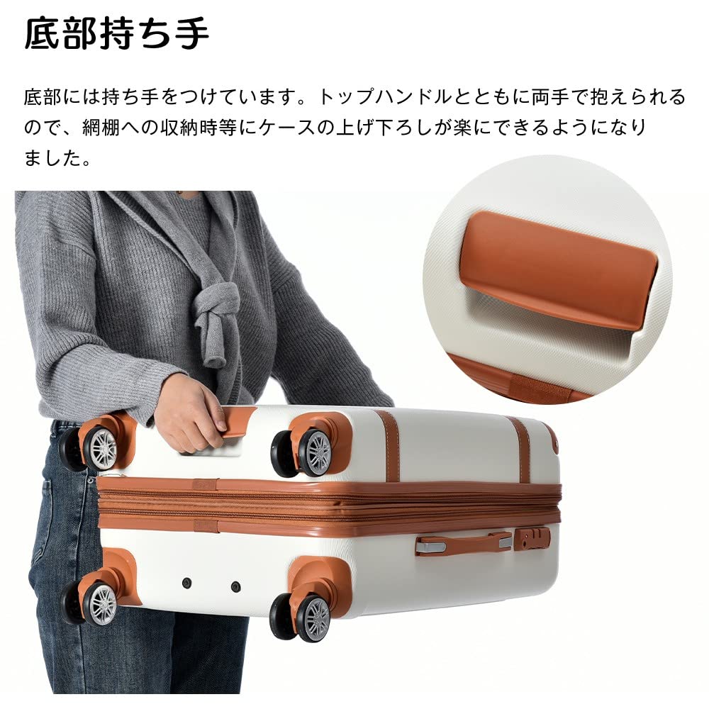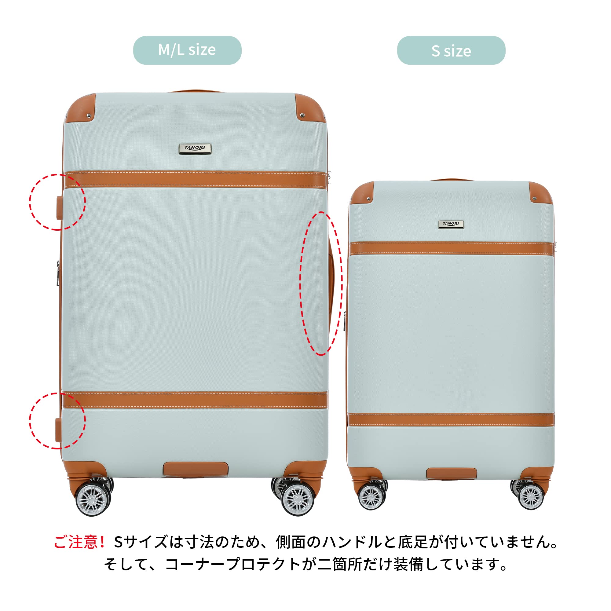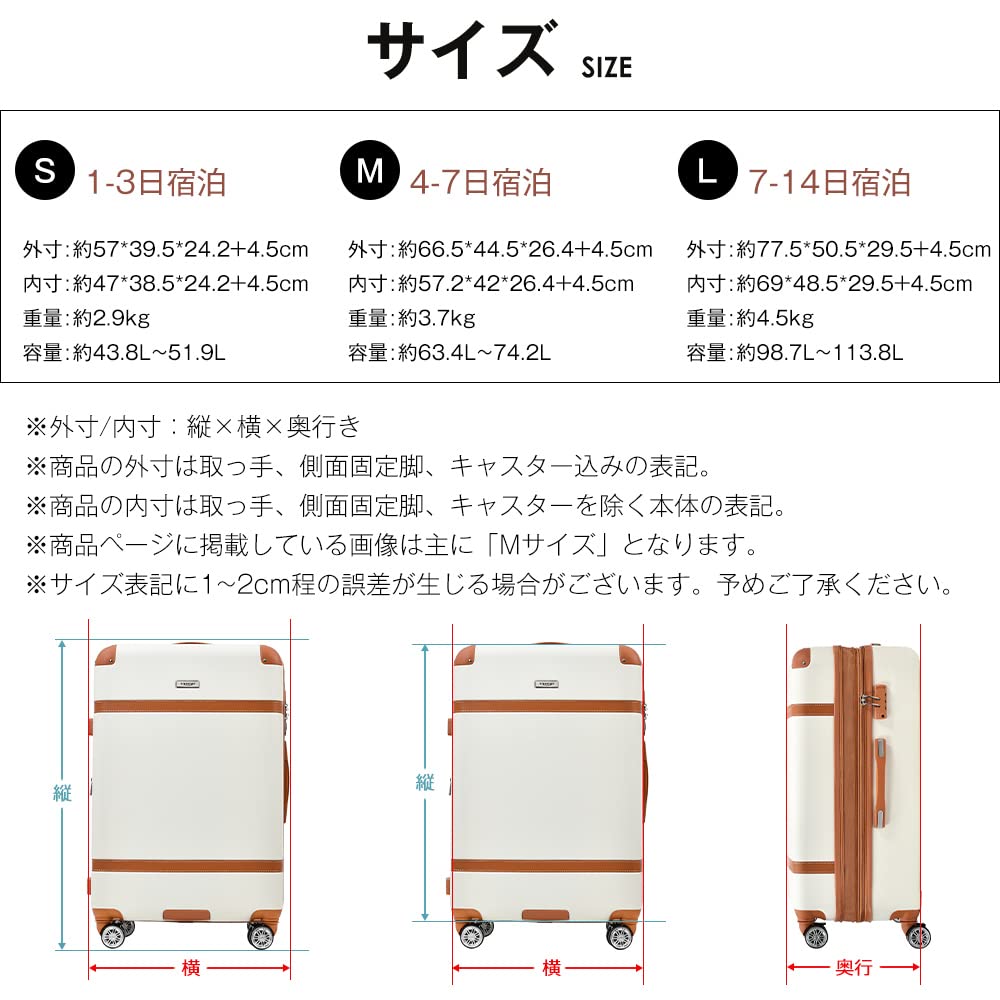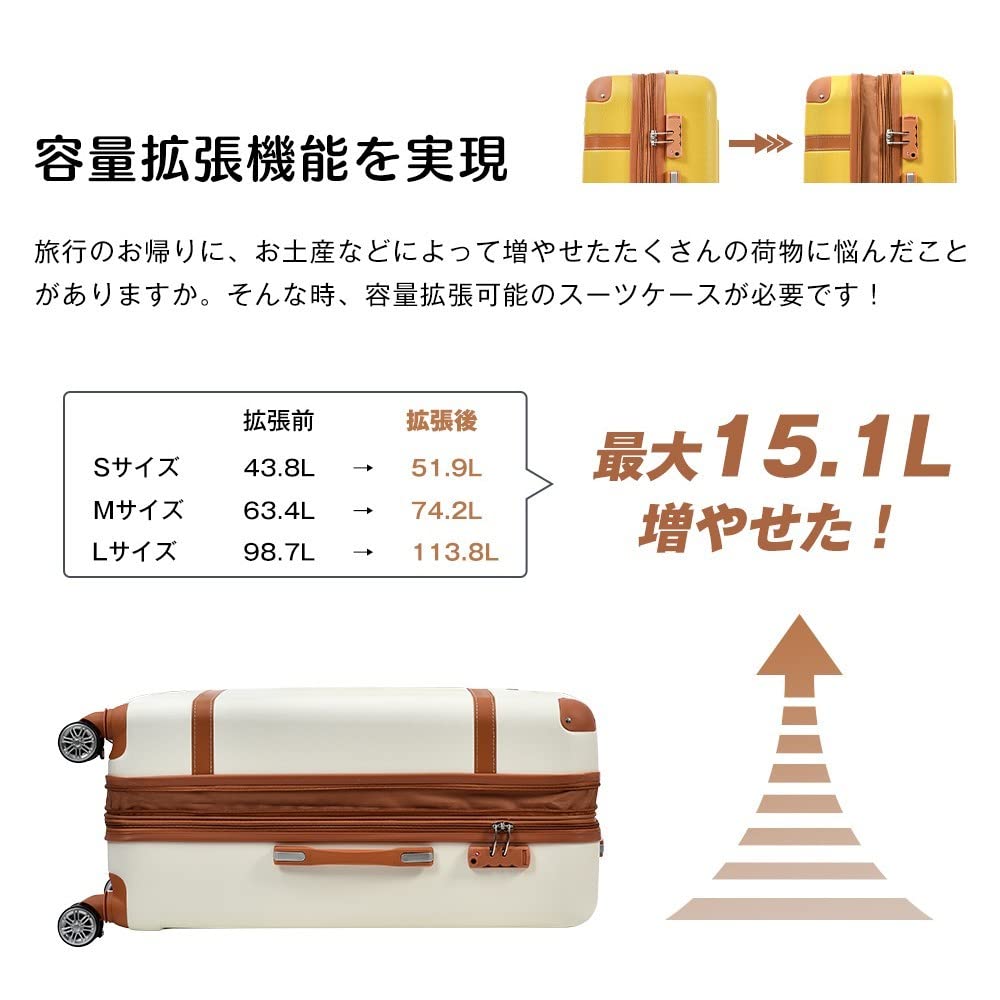 ポイント1.優れたキャスター 段差や石畳の走行に強いWキャスターは360°どの方向にも安定感があり、スムーズな走行が可能です。 ①ストッパー付き②ダブルキャスター③360°回転④60mmの大型キャスター ポイント2.外旅行の必要品「TSAロック」搭載 アメリカ(ハワイ、グアム、サイパン含む)及びカナダの空港で荷物を預ける際に、カギをかけたまま預けることができるTSAロックを採用しています。セキュリティの不安をばっちり解消します。 ご注意:カギはついておりません。予めご了承ください。 ポイント3.容量拡張機能を実現 旅行のお帰りに、お土産などによって増やせたたくさんの荷物に悩んだことがありますか。 そんな時、容量拡張可能のスーツケースが必要です! 簡単に約4.5CMの拡張が可能!! ポイント4.多段階調節キャリーバー キャリーバーはスムーズな伸縮性があり、最高点まで引くと、およそ103cmです。?らす程度は10mm以内で、引きやすさを保つ上で、ある程度の緩衝作用も効いています。 ※ Sサイズは2段階調節で、MとLサイズは3段階調節です。予めご了承ください。 ポイント5.たっぷり入る使いやすい内装 仕切りには小物の収納に便利なメッシュポケット付きで、細かい仕分けることができます。 また、両面ともクロスバンドがついているので、荷物をしかっり固定できて、荷崩れも防止してくれます。 ※内部ファスナーについて ケース内部にあるファスナーはメンテナンス専用ファスナーとなります。修理が必要になった場合のみ使用するファスナーのため、あえてファスナーのつまみがついていません。お荷物を入れるものではないので、ご了承ください。 ポイント6.高級樹脂ABS材質/スクラッチ仕上げ ボディー素材には軽量で強度の高いABS樹脂を使用し、耐衝?性に優れ、強い衝撃から荷物を守ります。 ポイント7.底部持ち手 底部には持ち手をつけています。トップハンドルとともに両手で抱えられるので、網棚への収納時の際等にケースの上げ下ろしが楽にできるようになりました。 ご注意:Sサイズは寸法のため、側面のハンドルと底足が付いていません。予めご了承ください。