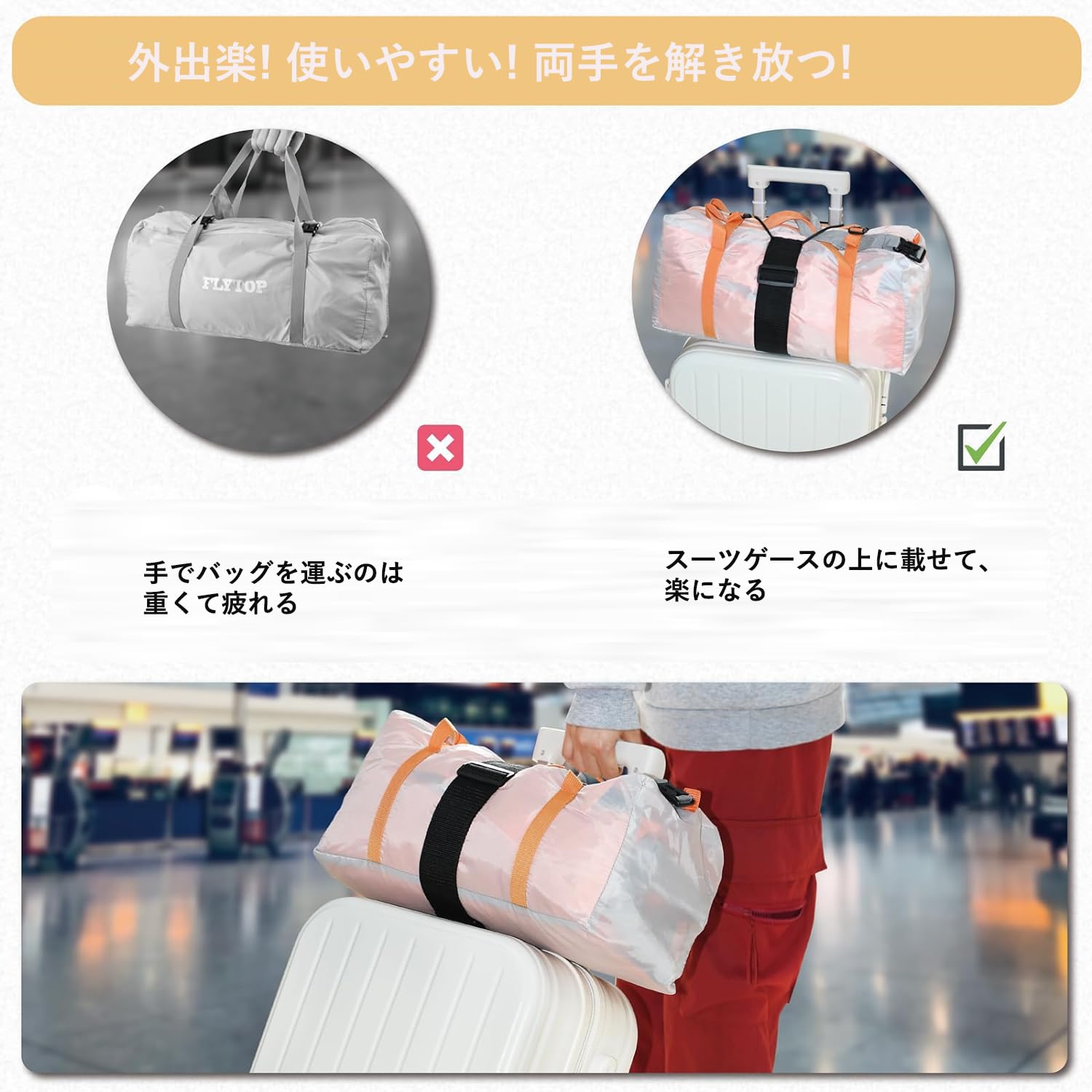 【手荷物楽々スッキリ安心】スーツケースの上に手荷物をがっちりホールドできる機能ベルト。長さ調節もスムーズに行えます。キャリーの上に荷物を載せてもズレ落ちない 便利 旅行グッズ トラベルグッズ です。