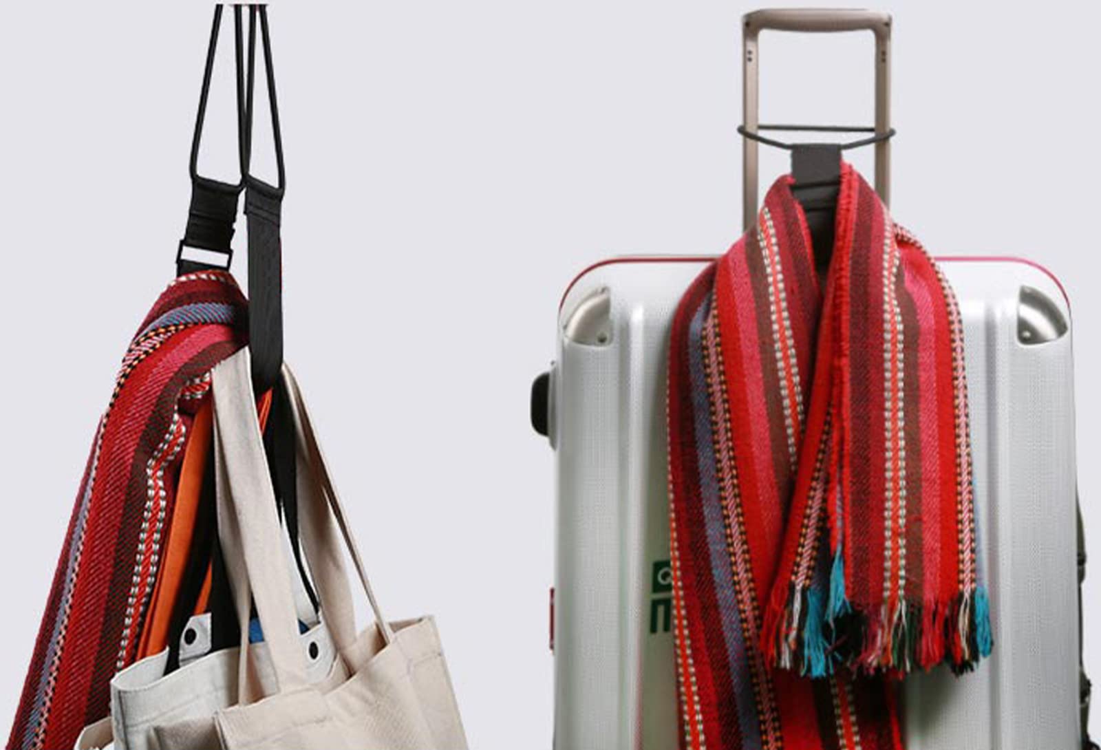 【シーン】トラベルバッグ・キャリーバックに荷物を簡単に固定することができます。 ほとんどのスライドハンドル付旅行用キャリーに使用可能です。出張 国内旅行 海外旅行 電車 飛行機 移動時に キャスターバッグを持っていくときに役に立ちます。使わないときは畳んで旅行バッグの中にしまっておけるコンパクトさも人気の秘密です。