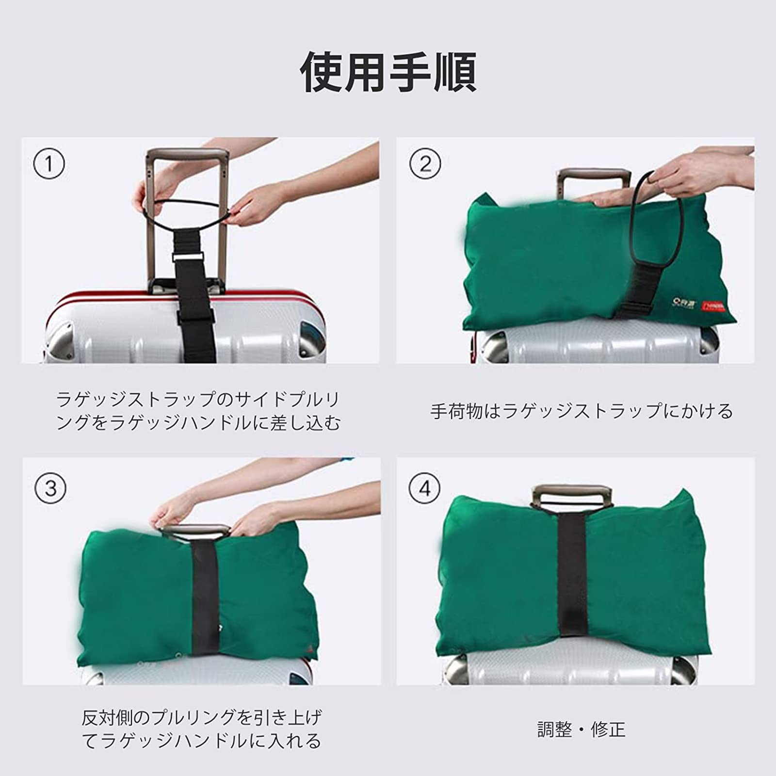 【特徴】スーツケースの上に手荷物をがっちりホールドできる機能ベルト。長さ調節もスムーズに行えます。キャリーの上に荷物を載せてもズレ落ちない 便利 旅行グッズ トラベルグッズ です。