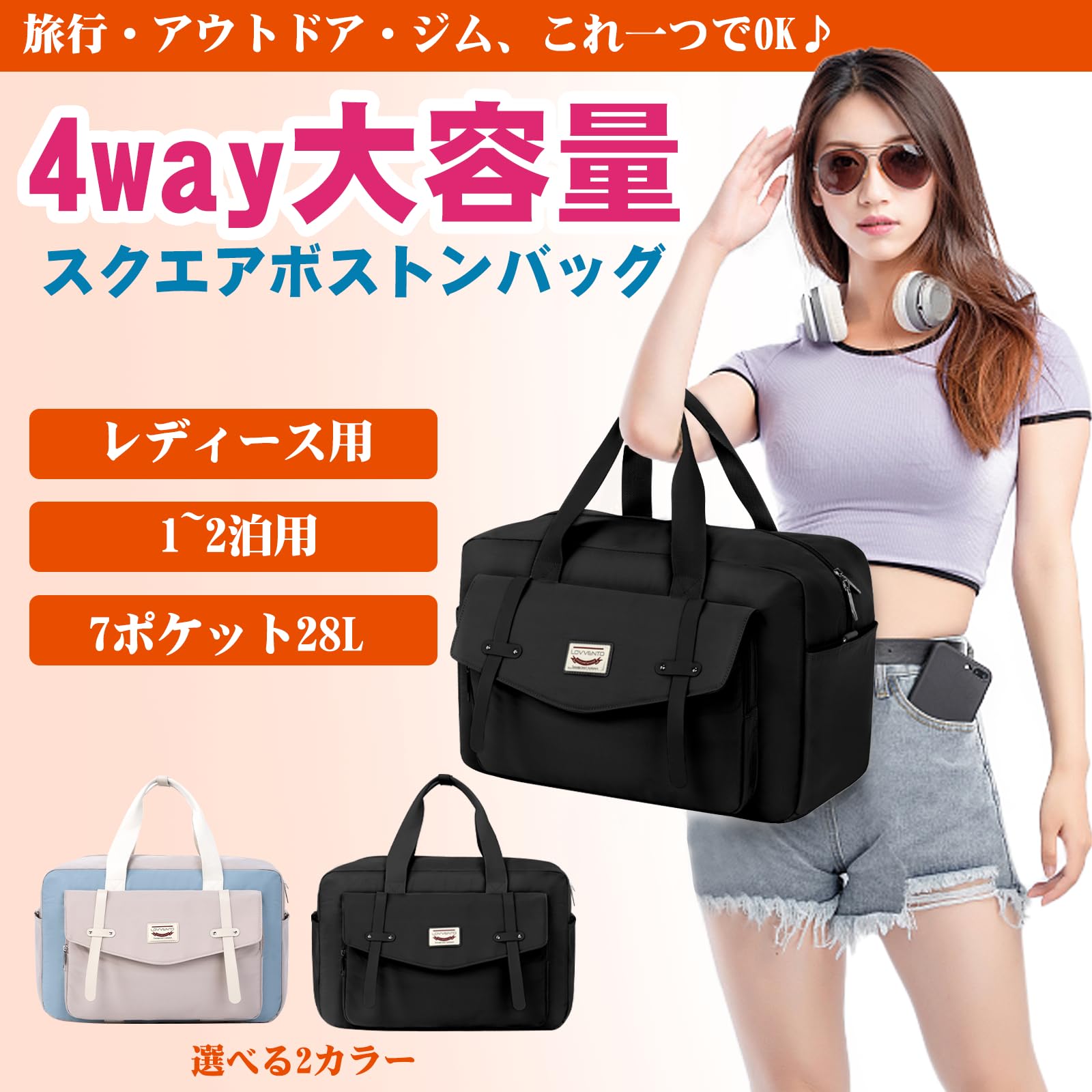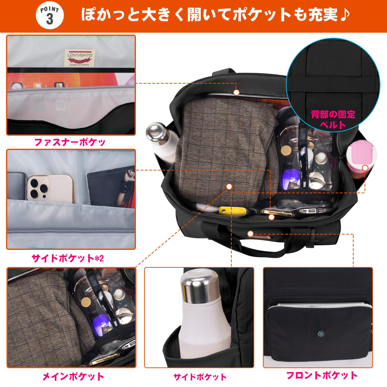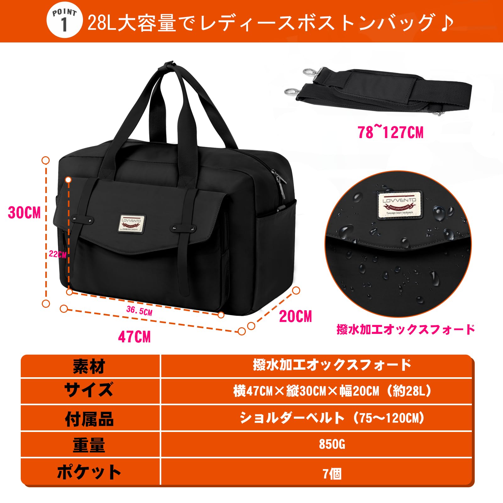 【新着特価】LOVVENTO ボストンバッグ レディース 4way 手提げ 斜め掛け キャリーオン機能 大容量 マカロン色 可愛い ダッフルバッグ 撥水加工 機内持ち込み 1泊2泊 修学旅行 通学 通勤 ショルダーベルト付き 17ポケット 28L (ブラック)