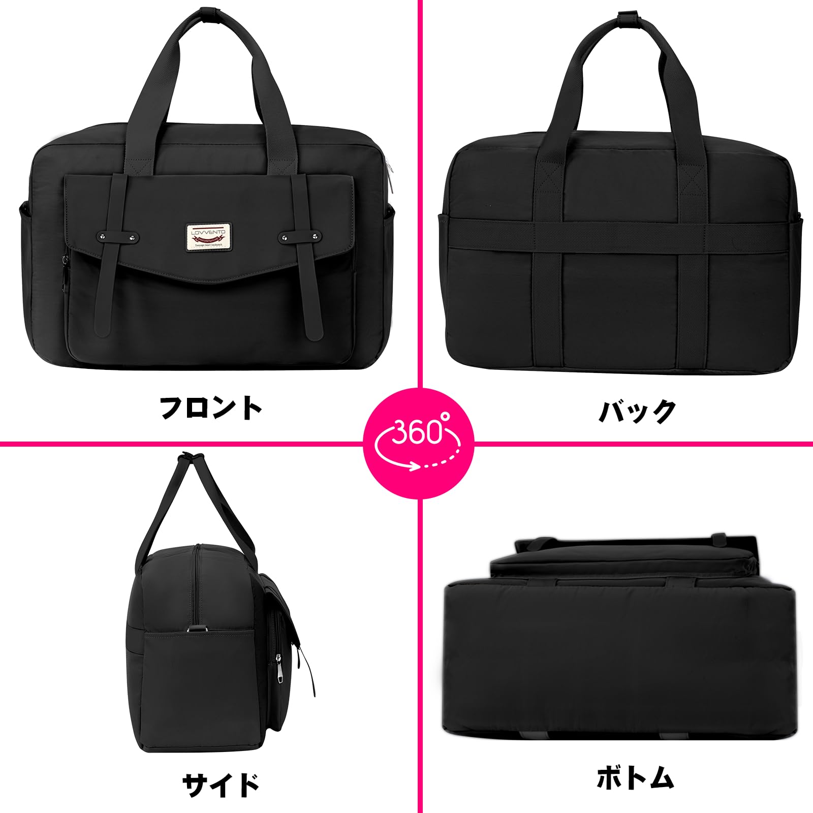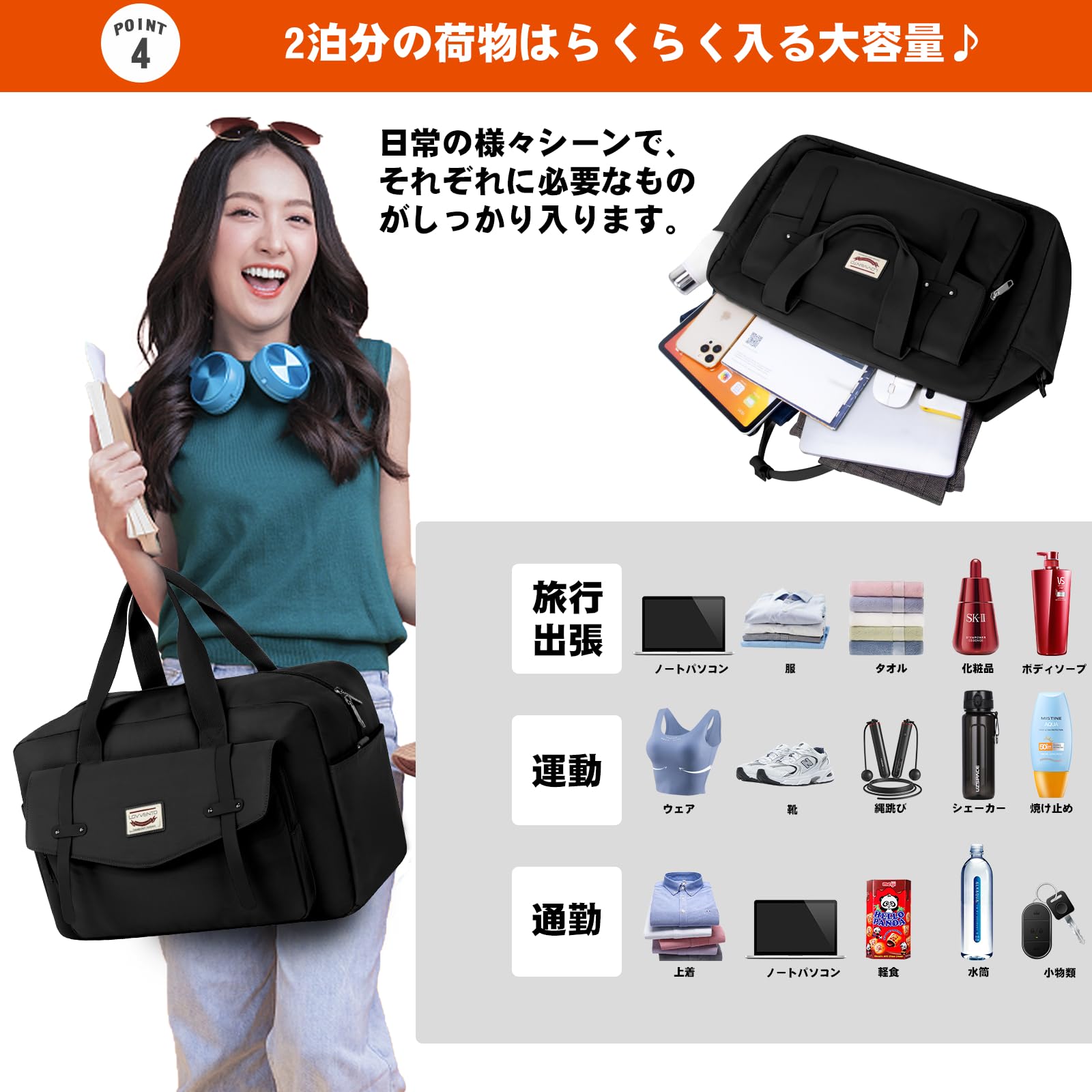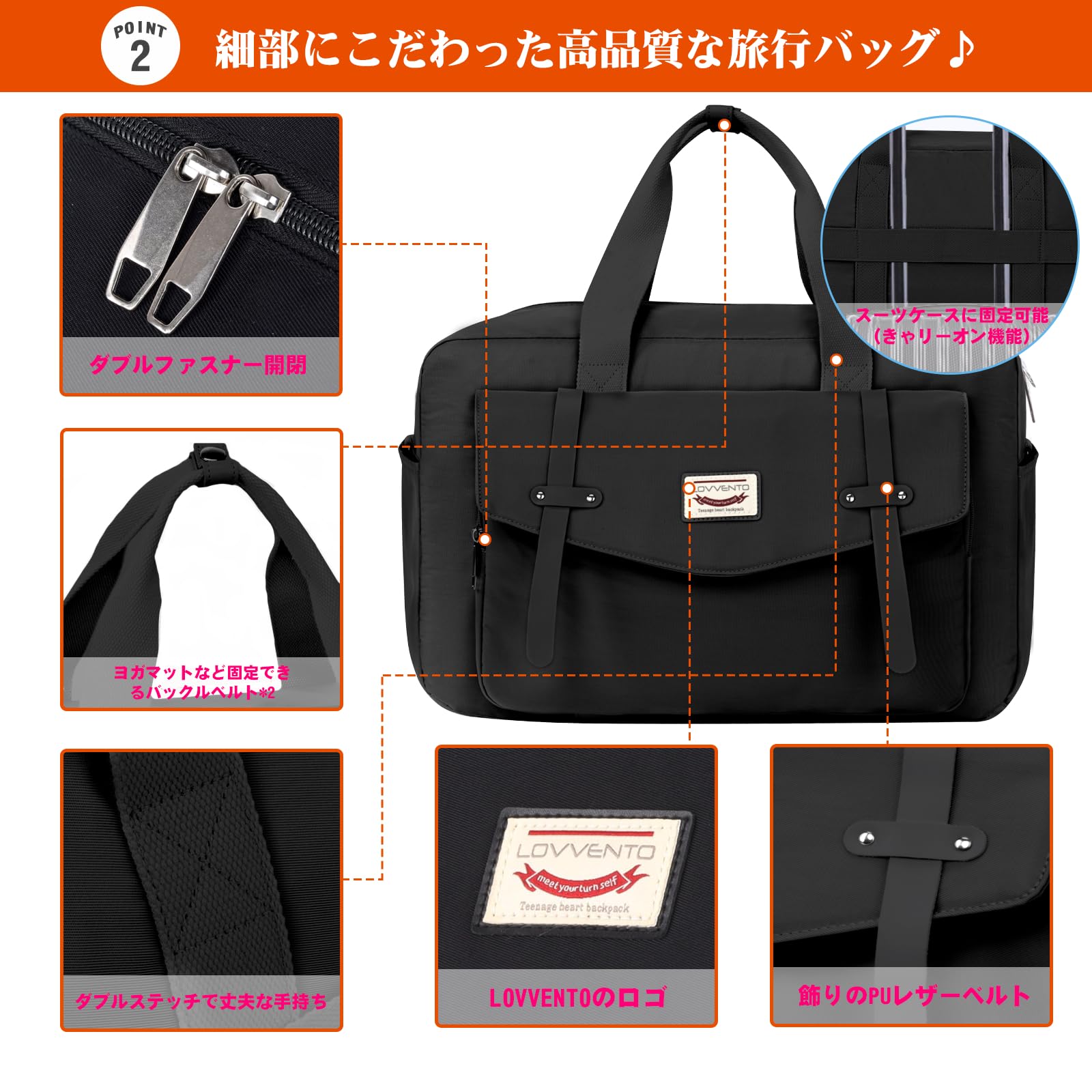 LOVVENTO ボストンバッグ レディース 4way 手提げ 斜め掛け キャリーオン機能 大容量 マカロン色 可愛い ダッフルバッグ 撥水加工 機内持ち込み 1泊2泊 修学旅行 通学 通勤 ショルダーベルト付き 17ポケット 28L (ブラック)