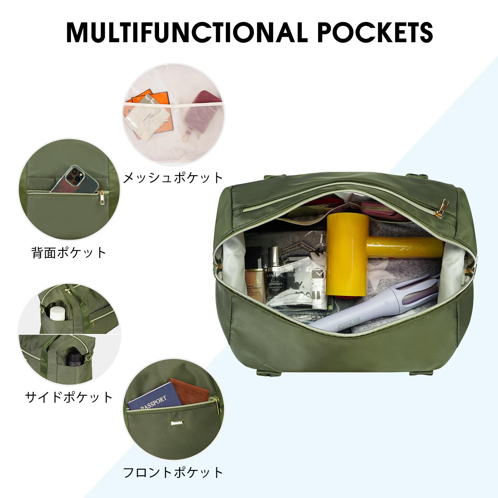 【多ポケット】メイン収納の他に、フロントポケット・2つの内部メッシュポケット(メガネ、電話、財布などの整理に適しています)・2つのサイドメッシュポケット(水筒や傘の収納に便利)があり、荷物を分けて収納できます。修学旅行時のトラベルバッグ 、入院バッグ、ボストンバッグ・ジムバッグ等様々なシーンで活躍します。