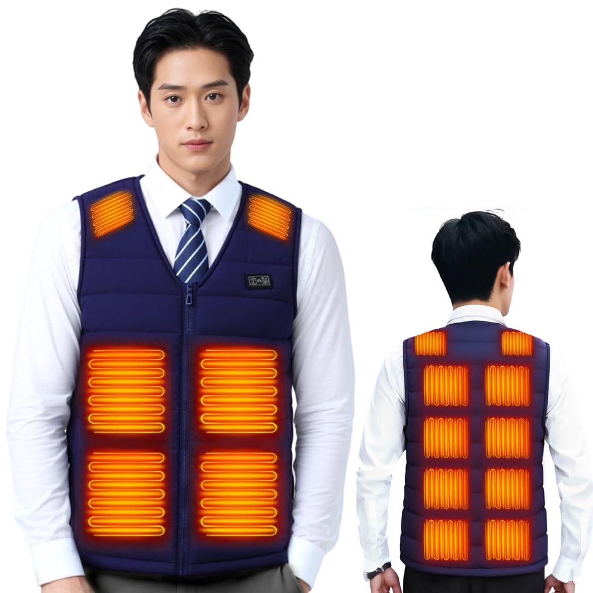 【2025新登場・16箇所発熱・前後独立温度制御】電熱ベストの前部には6つの発熱素子が内蔵され、後部には10個の内蔵発熱素子が配置され、合計16箇所で効果的に発熱します。肩部、背中、腰部、腹部など体温変化を感じやすい部位に、16箇所の発熱素子で精密に加熱し、全身を温めます。電熱ベストの前後温度は独立して調節可能。胸部の2つの電源ボタンで前部と後部の発熱シートを個別に制御でき、環境や気温に応じて加熱部位と温度を選択可能。寒い季節でも体を温かく保つ電熱ベストです。