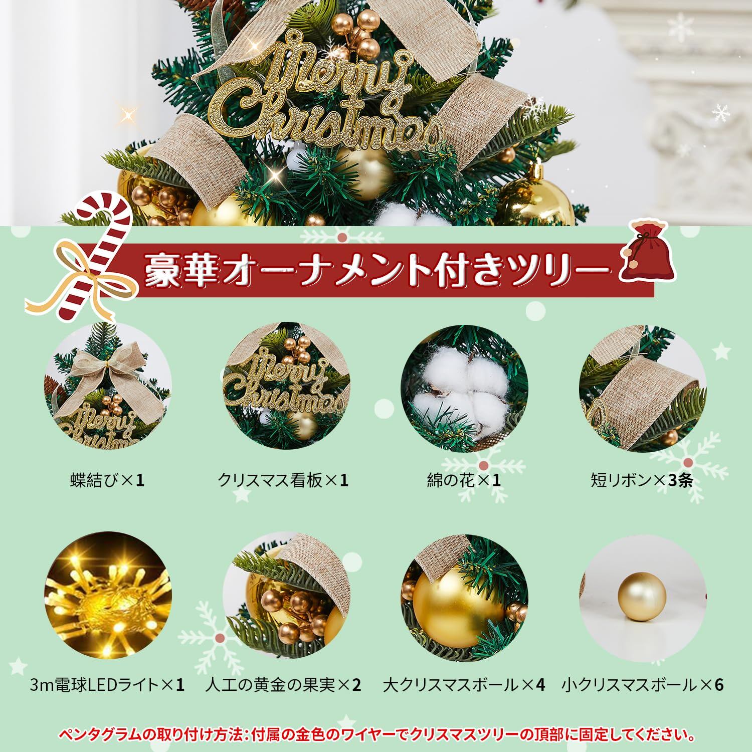 ??【アフター】 クリスマスツリー本体とベースには1年間の品質を提供いたします。クリスマスツリー本体の品質に問題がある場合は、無料で交換またはいたします。また、付属品は多数付属しておりますが、商品到着時に付属品が不足していた場合は再発送致しますのでご連絡下さい。注: わずかな葉の脱落は正常です。子供やペットのいる家庭は、落ちた雪を速やかに片付けること。