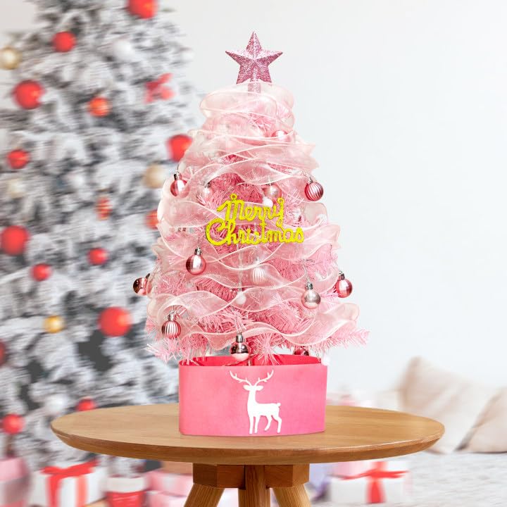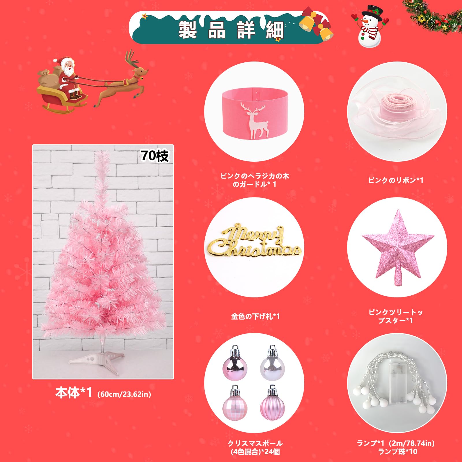 【本体サイズ】約高さ 55cm。素材:ツイッグ / PVC。ピンクのレース生地、クリスマスオーナメント、ピンクの不織布の樹幹カバー、トップスター、クリスマスボール、LED ライトガーランドが付属しており、木をキラキラと輝かせます。光る LED ライトガーランドはとても美しく、クリスマスツリーを華やかに演出します。