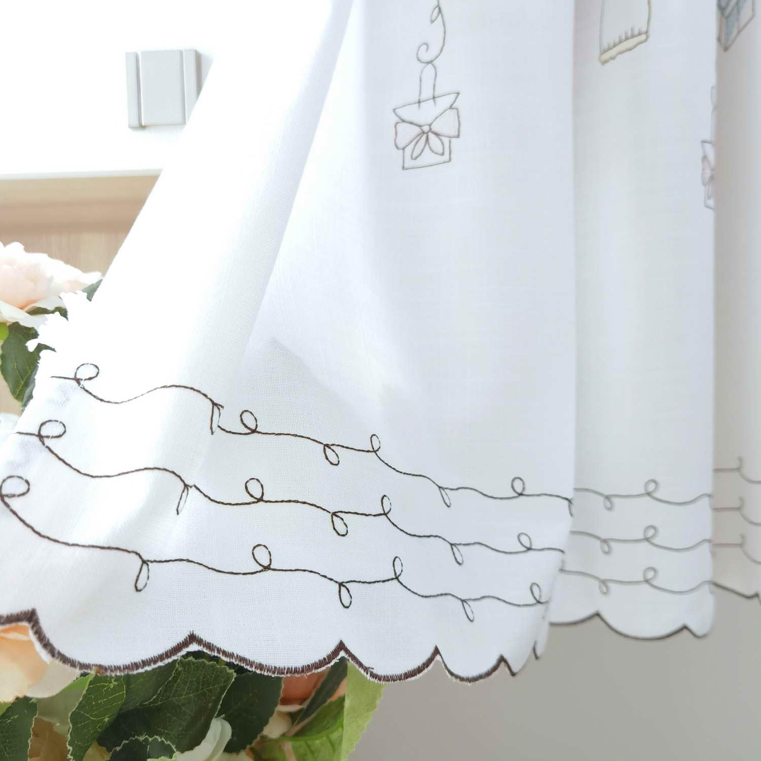 ★可愛い花の刺繍があらわ、お部屋を華やかな雰囲気に仕上がれます。半遮光質感ですが、キッチンやトイレの小窓やお部屋の間仕切り等にいいです。目隠しには良いドレープ感があります。