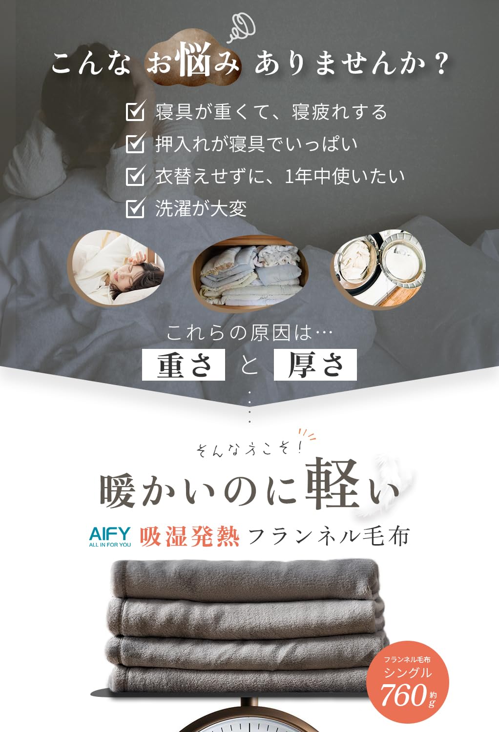 【在庫のみ】AIFY 毛布 シングル ブランケット 秋冬用 大判 ふわふわ あったか フランネル マイクロファイバー 軽量 洗える 静電気防止 四季適用 おしゃれ 140×200cm グレー