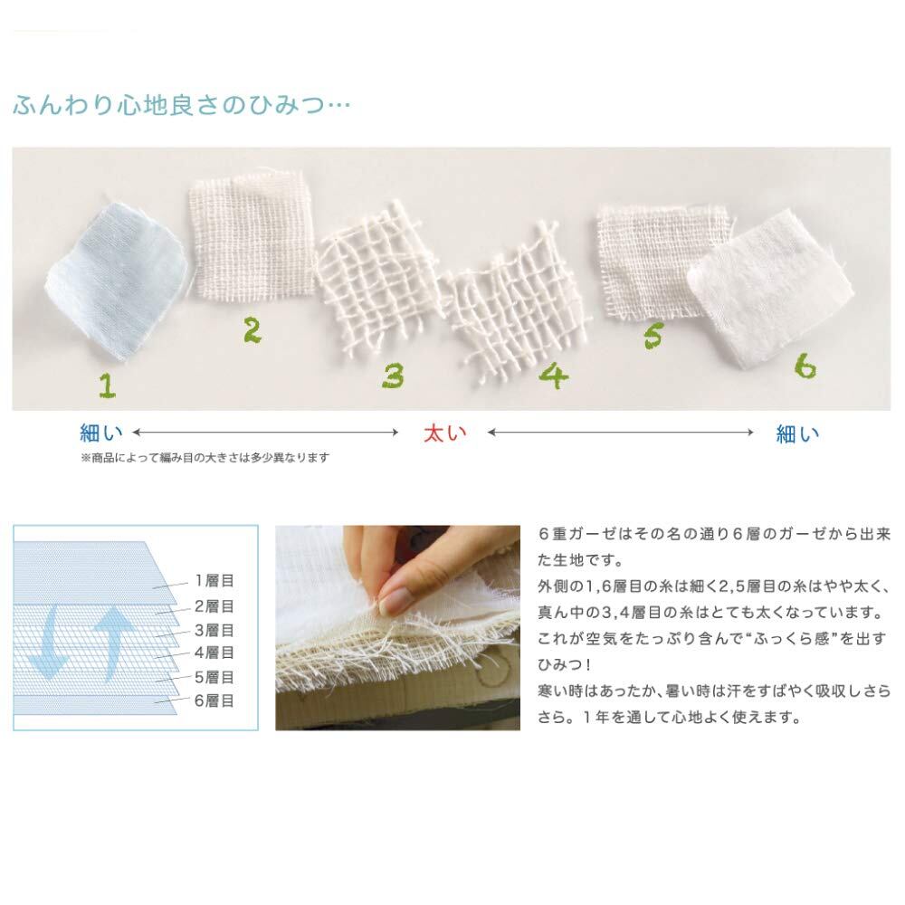 織目の密度が異なるガーゼを6層に重ねることで、ふんわり空気を含み、寒い時は保温性を発揮し、暑い時は汗を素早く吸収しさらさら。