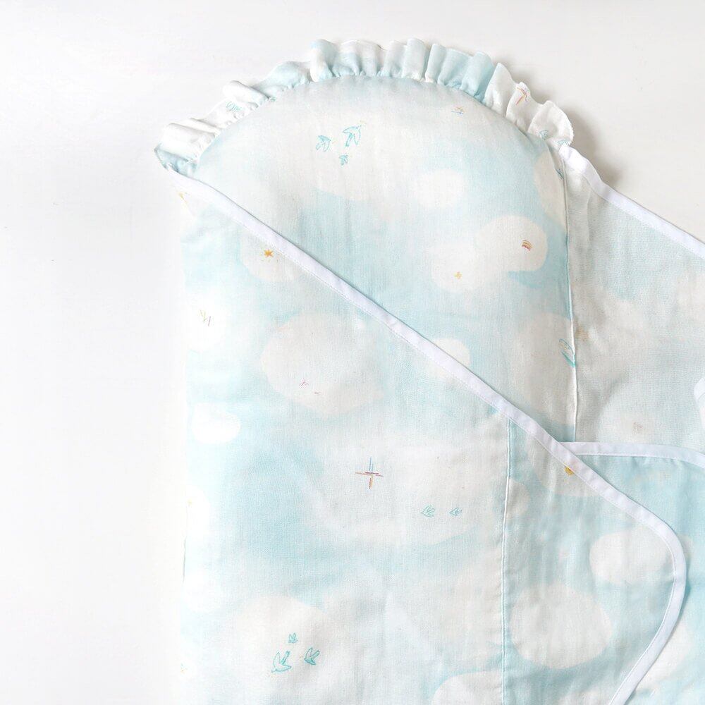 おくるみは、綿のやわらかさを最大限に引き出し、できる限りあまく織り上げたわたガーゼを使用した生地をつかっています。