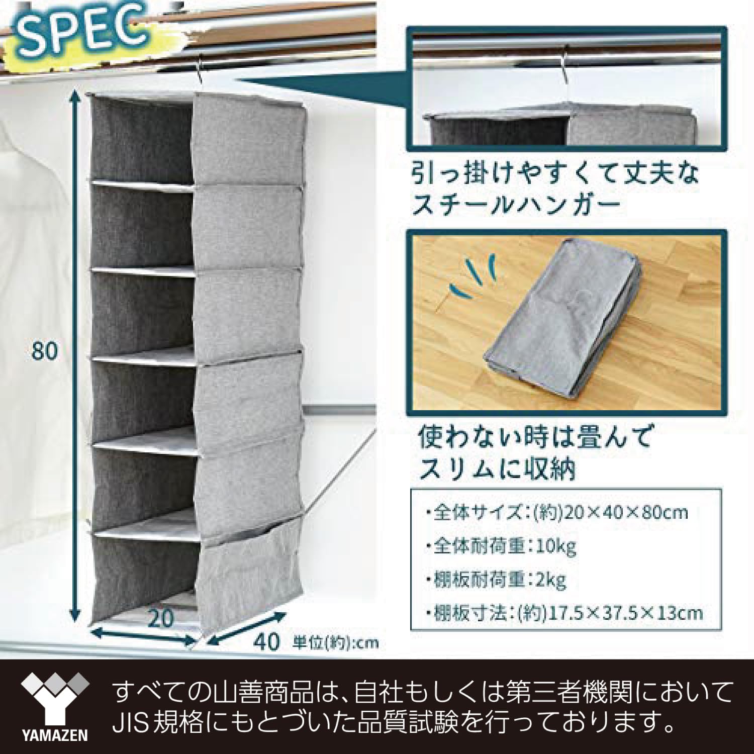 山善(YAMAZEN) 吊り下げ収納 Lサイズ 頑丈な棚板 大小サイドポケット スチールハンガー(引っ掛けやすく頑丈) ハンギングラック クローゼット 収納 入院 出張 車 便利グッズ 完成品 グレー YTCK-CLHRL(GY) 本体サイズ:幅30×奥行40×高さ80cm