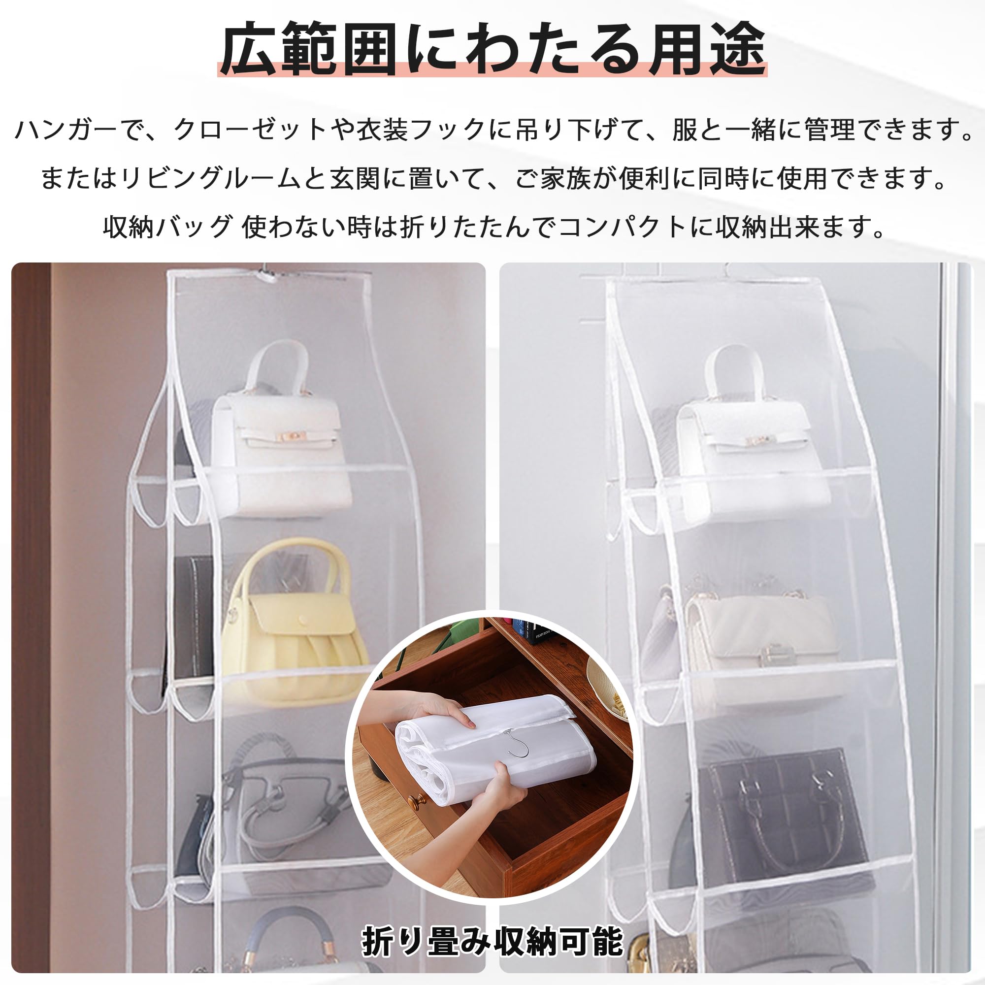 【スッキリ収納】クローゼットに吊るして、バッグをすっきり収納できます。ハンドバッグなど、散らかりやすいバッグをすっきり収納できる便利な収納ホルダーです! ハンガーで、クローゼットや衣装フックに吊り下げて、服と一緒に管理できます。またはリビングルームと玄関に置いて、ご家族が便利に同時に使用できます。収納バッグ 使わない時は折りたたんでコンパクトに収納出来ます。