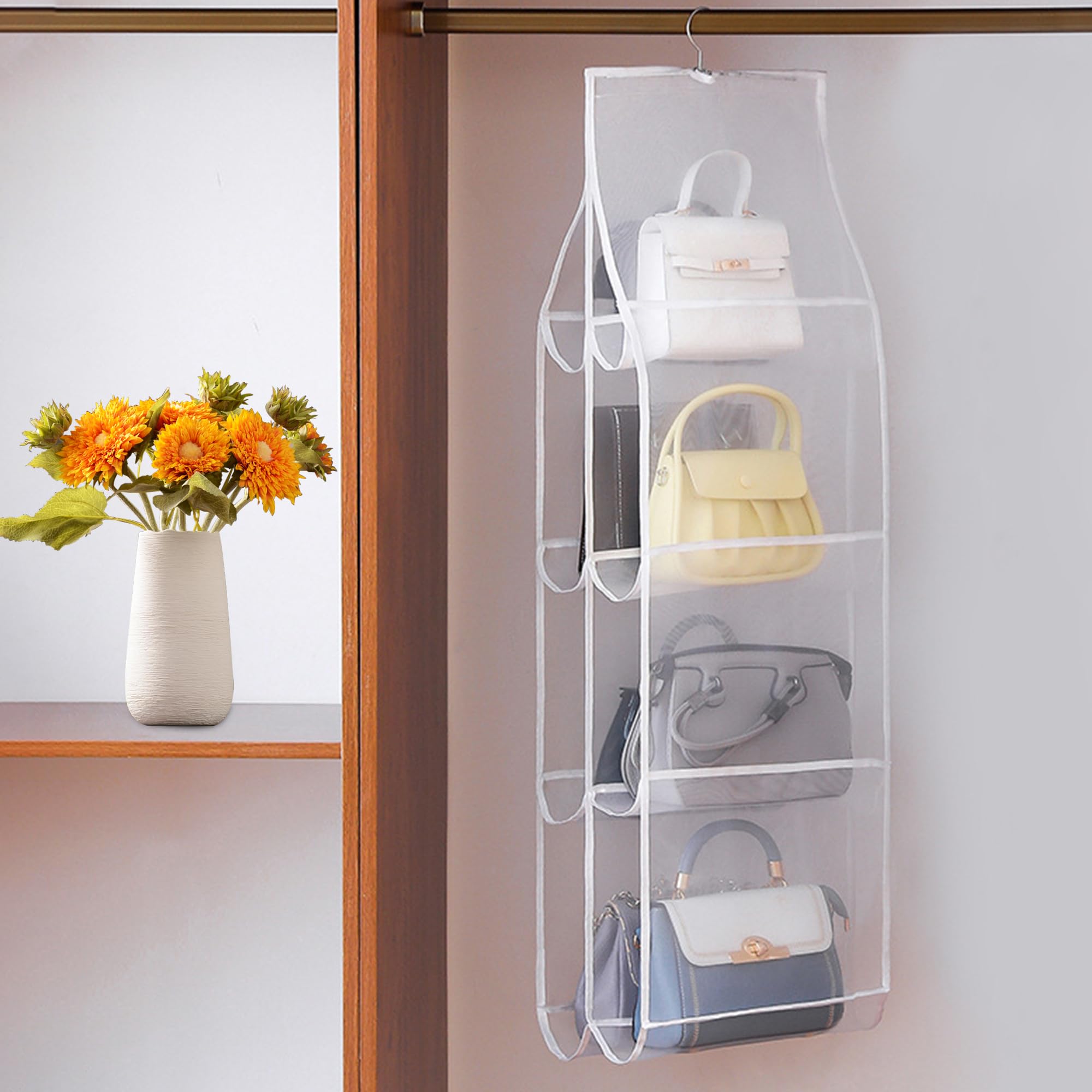 seOSTO バッグ 収納 吊り下げ収納 カバン 収納 4段式 折りたたみ 鞄 収納 両面収納 8個収納可能 水洗い可能 クローゼット 収納 バッグ収納ラック 省スペース 取り付け簡単 小物入れ収納ポケット 壁掛け 玄関 キッチン カバン掛け カバン収納 かばん 収納(ホワイト 4段式)