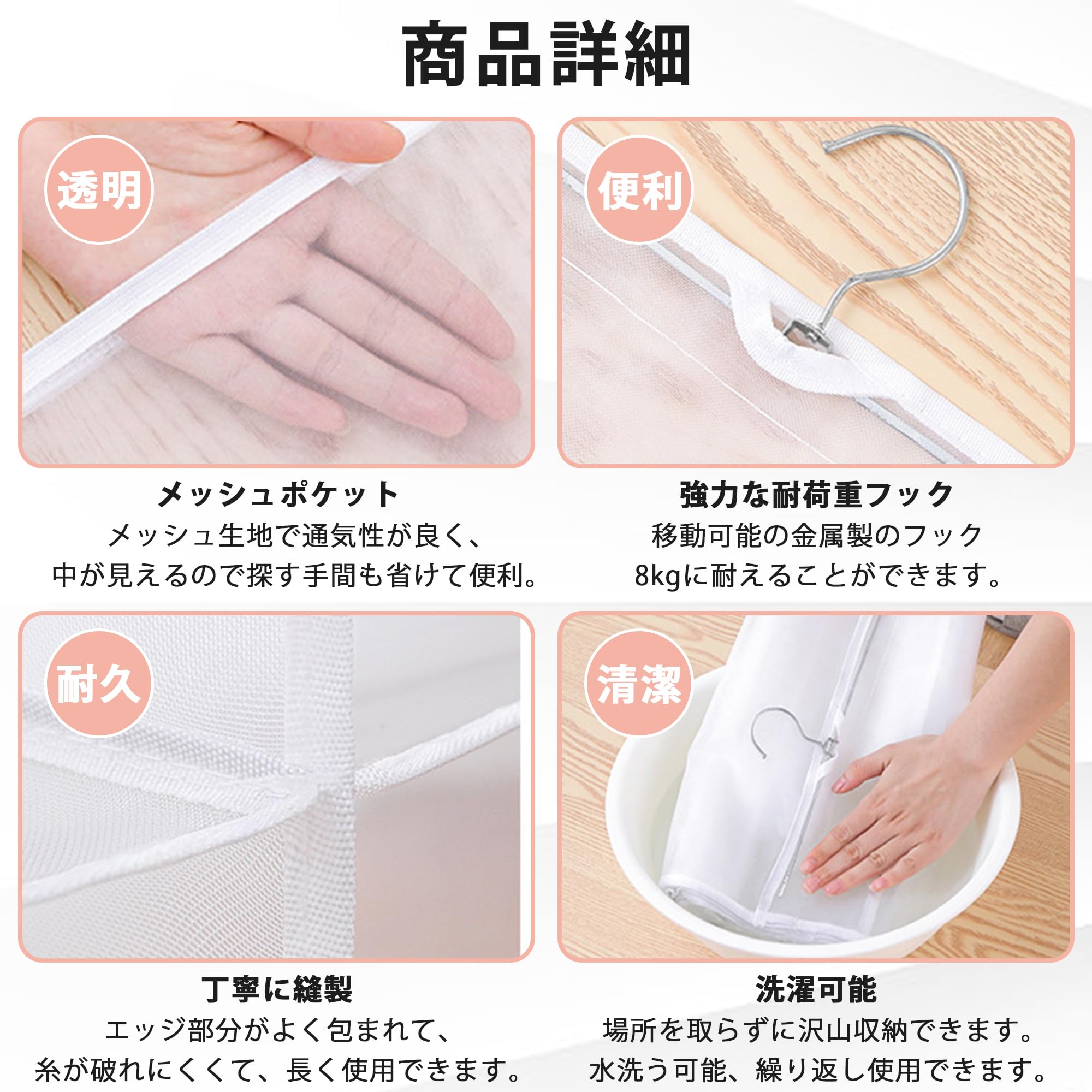 【品質の良い】かばん 吊り下げ収納 通気性も良く、耐久性に優れています。収納ラック 吊り下げは厳選した厚手の耐摩耗性のメッシュ素材で風通しがよく、よく縫合して、丁寧に製造しております。エッジ部分がよく包まれて、糸が破れにくくて、長く使用できます。中身が見やすい。繰り返して水洗っても形が変わらなく、フェードしません。バック収納 吊り下げ カバンかけ 安全で健康的で耐久性があり、美しく実用的で。