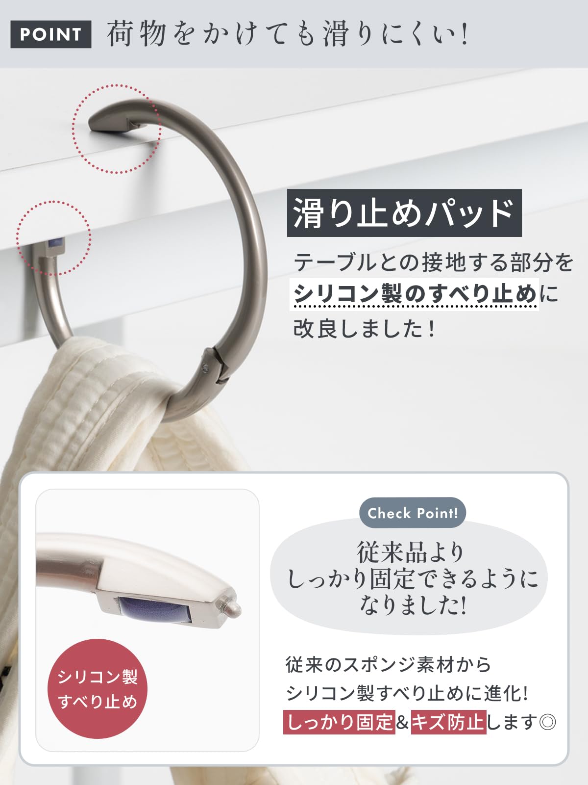 フック先端部分にはシリコン製のすべり止め付きでバッグがズレにくい!