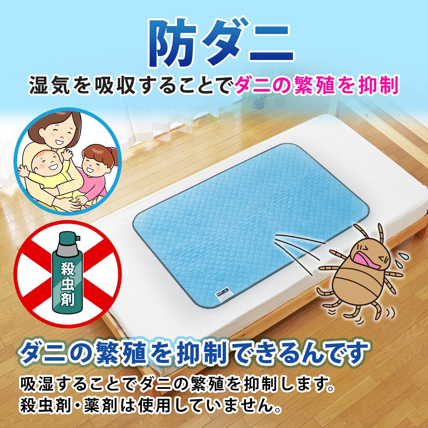 【湿気を吸い取りダニの発生を抑える】:シリカゲルの約2〜3倍の吸湿力がある特殊繊維を使用。吸湿することでダニの発生を抑制。