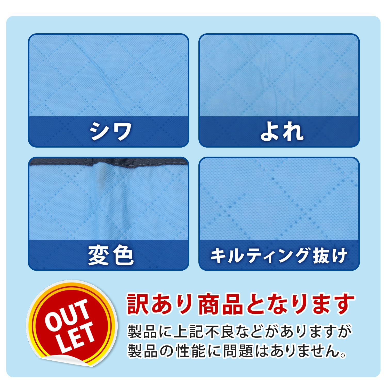 ●訳あり商品です。生地にシワやよれ、キルティング不良などがありますが製品の性能に問題はありません。