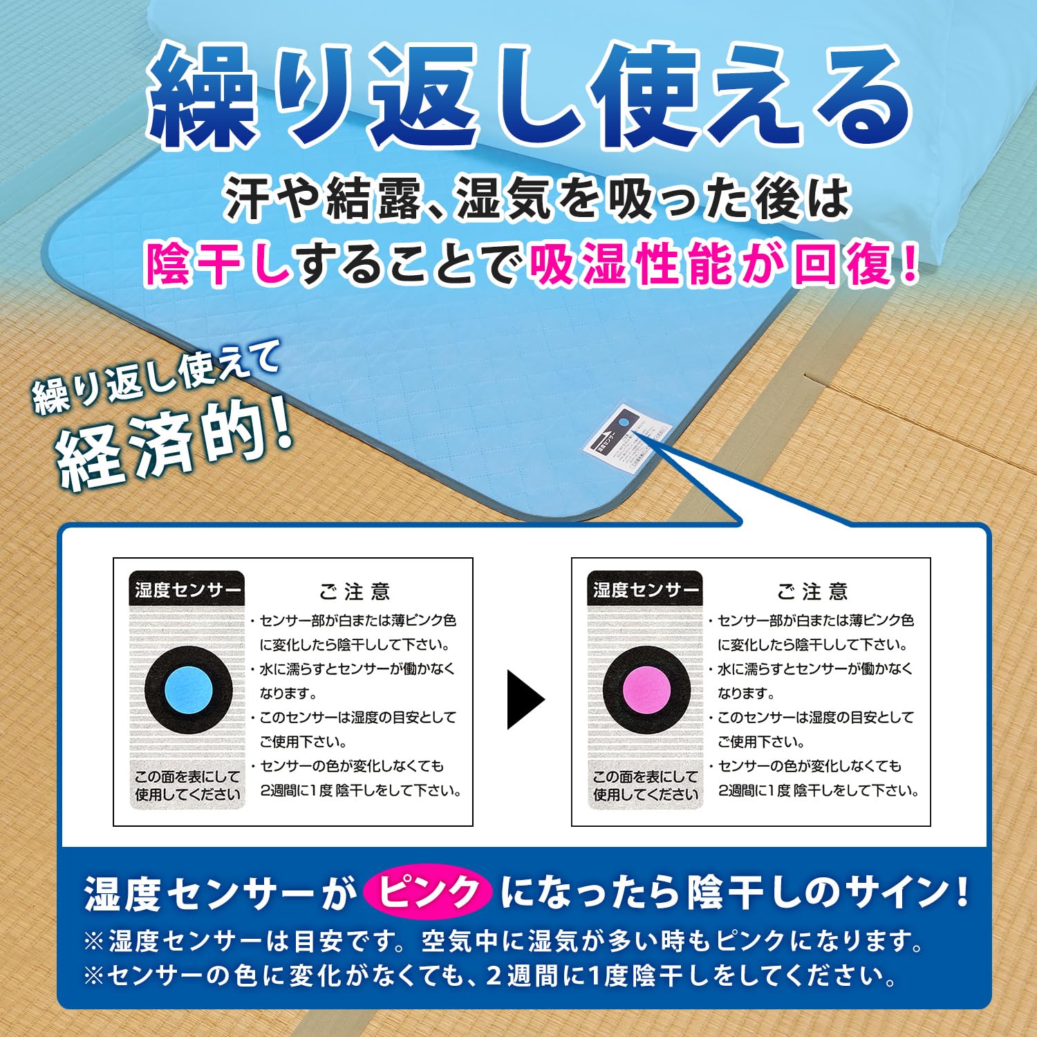【繰り返し使える・湿度センサー付き】:湿気を吸っても陰干しにより吸湿性能は回復し繰り返し使える。干し時が分かる湿度センサー付き。