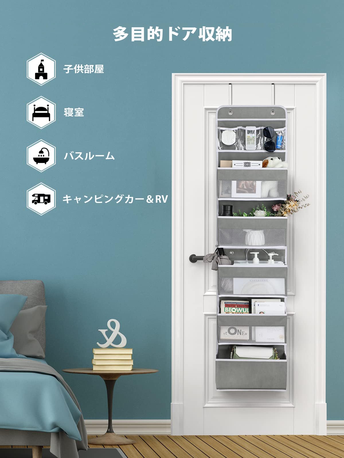 【省スペース】ドア掛け収納ポケットの4つの弾性フックでほとんどのサイズのドアやラックだけでなく、釘や壁掛けフックで壁に掛けることもできます(ご注意:厚さ4.2cm以下のドアに最適)。使用しないときは、フックと底板を取り外して折りたたむだけでスペースを節約できます。