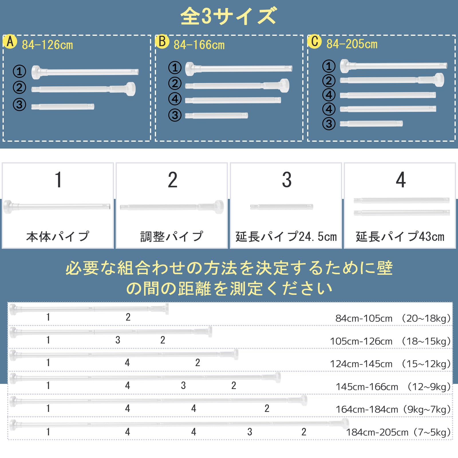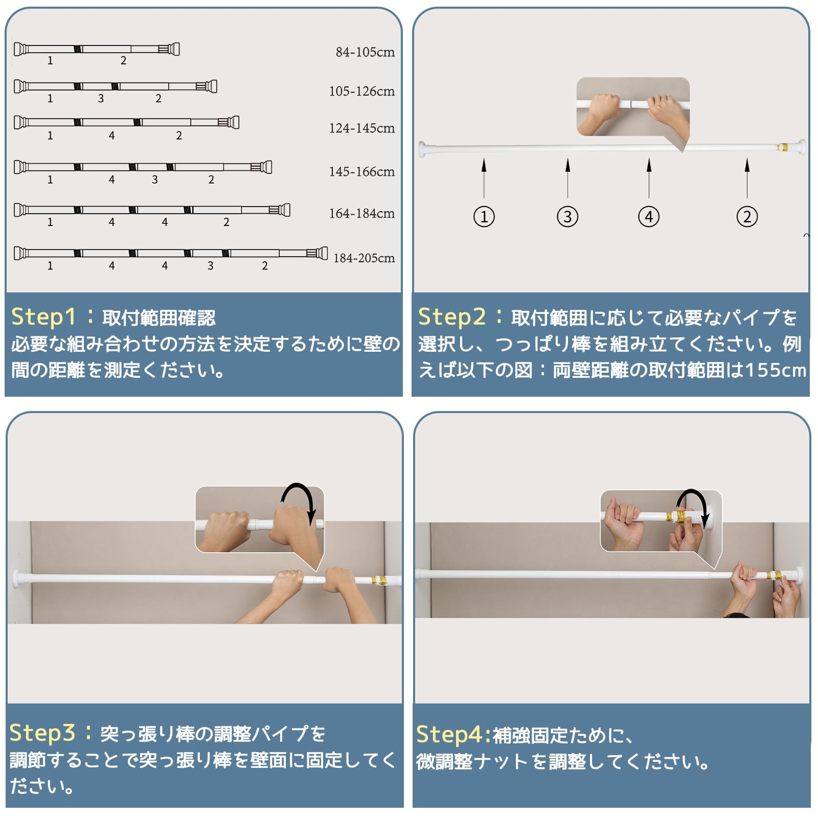 84cm~166cmの両壁距離を対応でき、つぎ合せ式のつっぱり棒は対応できる距離が長いだけなく、運賃を減らすので、さらにお得になります。