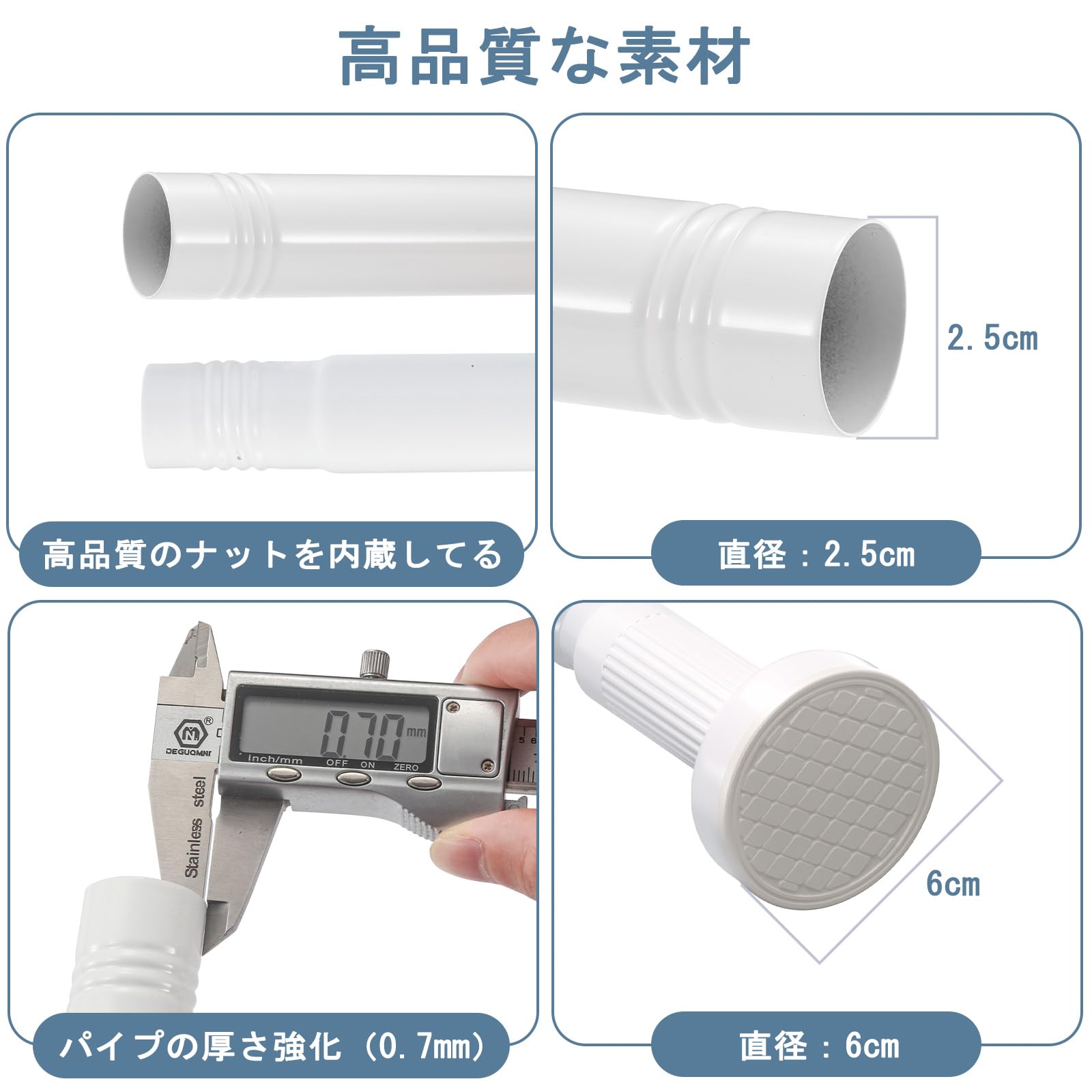 直径6cmの接地面も大きめなのでしっかりと固定できます。耐荷重性が高く安定性ばつぐんです。防錆コーティングを採用しますので浴室など湿気の多い場所でも錆びません。