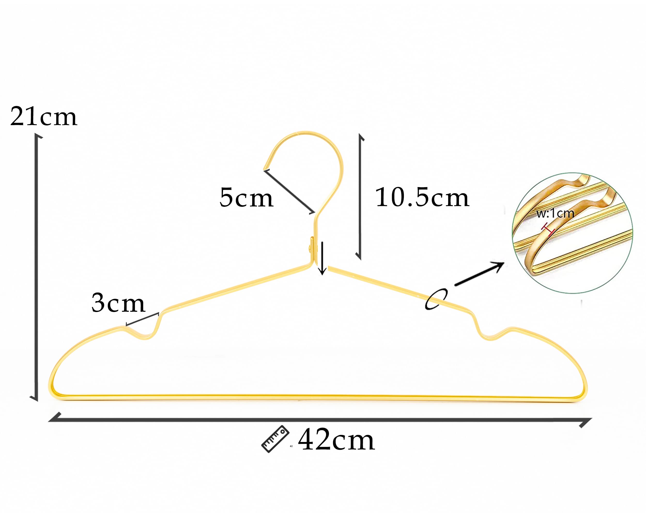 【品質】:錆びない素材で作られたアルミハンガーは長期間利用できます。ハンガーの表面にはゴールドの色をコーティングされ、更にお洋服の高品質感を演出します。